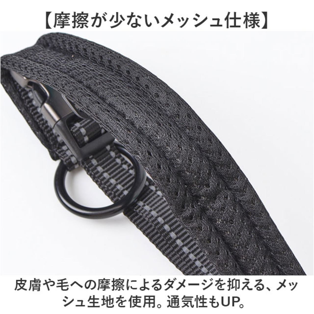 ・皮膚や毛への摩擦によるダメージを抑える、メッシュ生地を使用。通気性もUP。