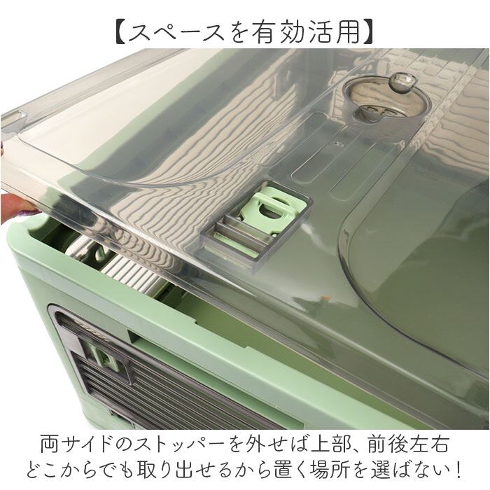 ・両サイドのストッパーを外せば上部、前後左右どこからでも取り出せるから置く場所を選ばない!