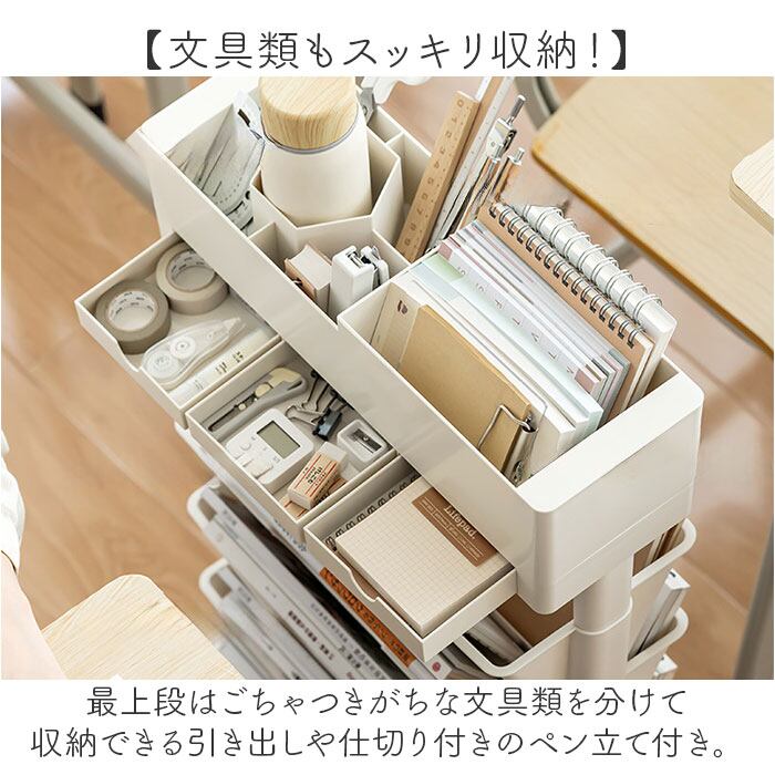 ・最上段はごちゃつきがちな文具類を分けて収納できる引き出しや仕切り付きのペン立て付き。