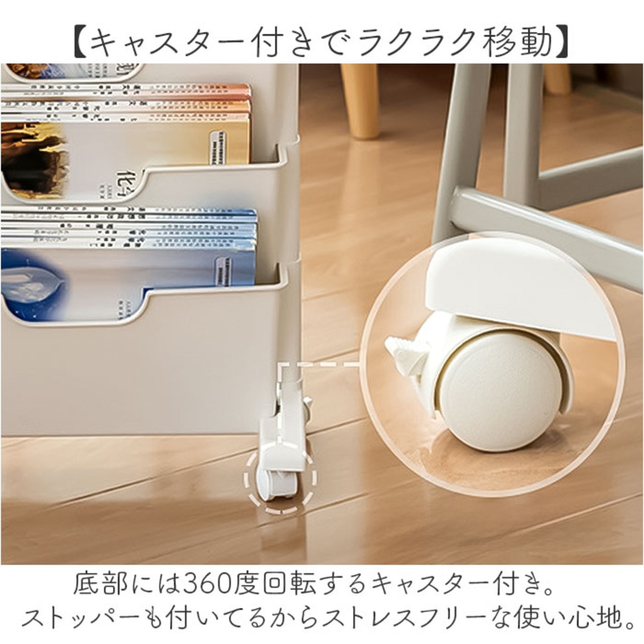 ・底部には360度回転するキャスター付き。ストッパーも付いてるからストレスフリーな使い心地。