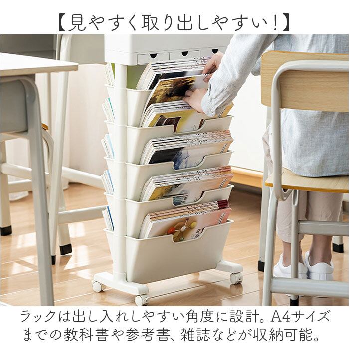 ・ラックは出し入れしやすい角度に設計。A4サイズまでの教科書や参考書、雑誌などが収納可能。