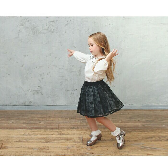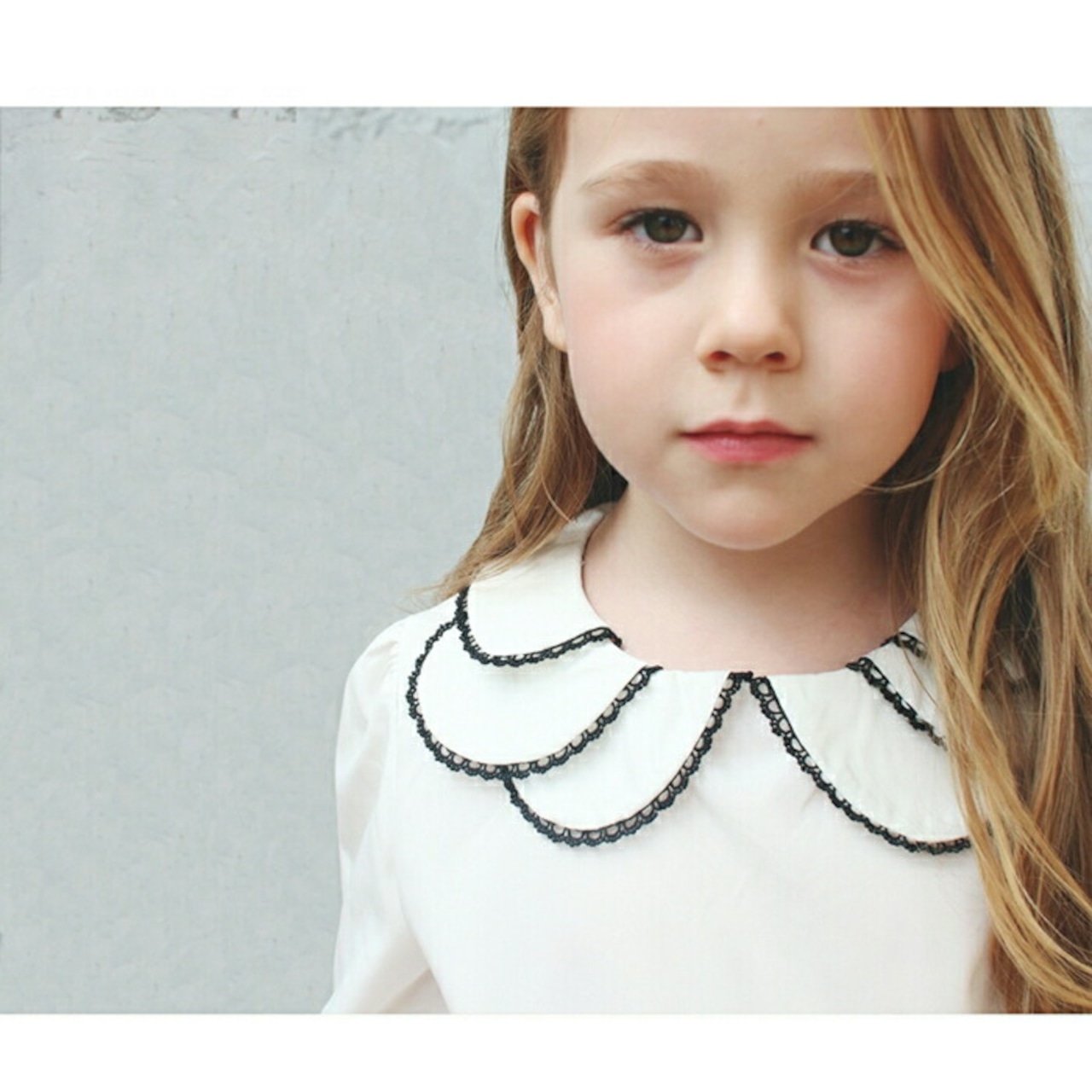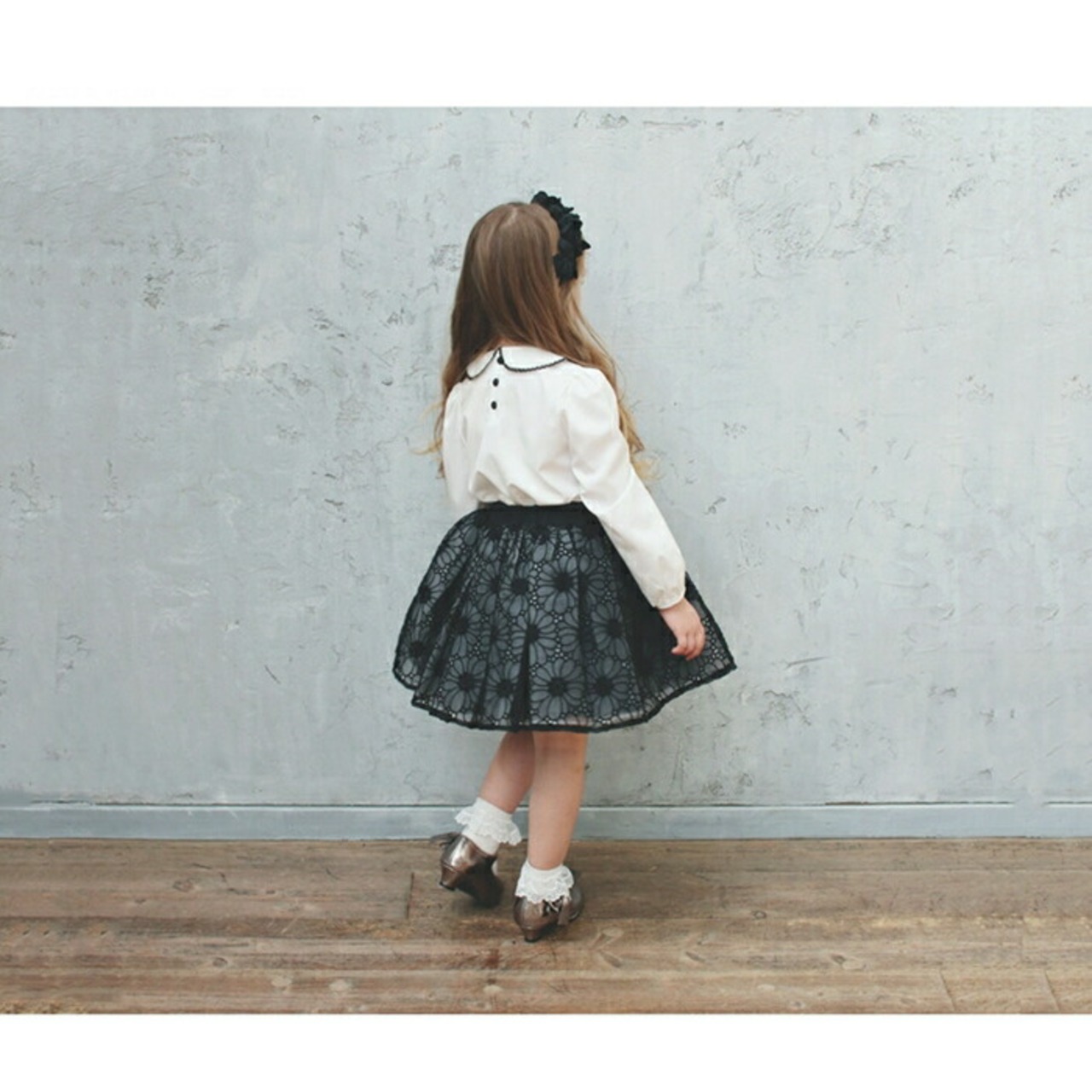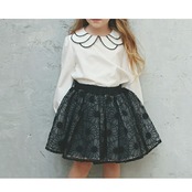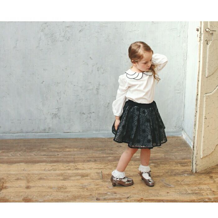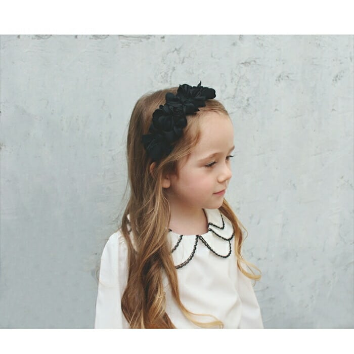 ・クラシカルな雰囲気のラウンドカラーを花びらのように重ね、シックな黒いレースで縁取ることで顔まわりを甘すぎず凛とした印象に引き立てます。