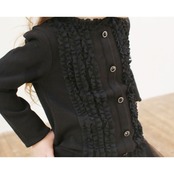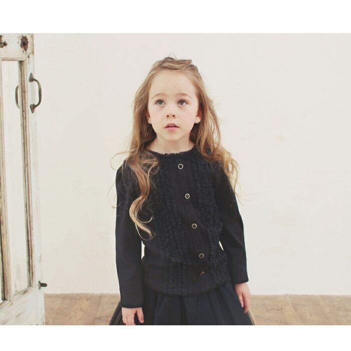 ・フリルとフェイクボタンがさりげなく光る カーディガン風のブラックロンT。
