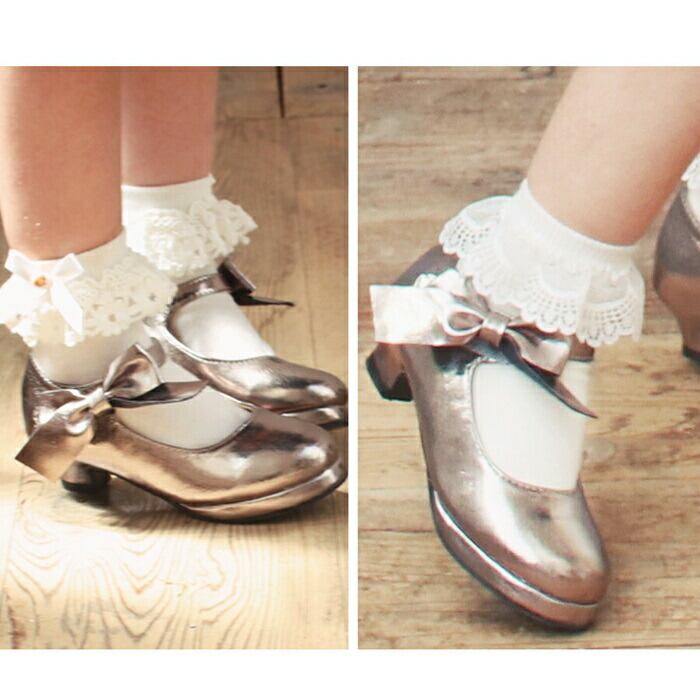 ・まるでリボンをそのまま足首に結んだように見えるストラップは面ファスナー式なので、お子さまの足に合わせてぴったりとお留めいただけます。