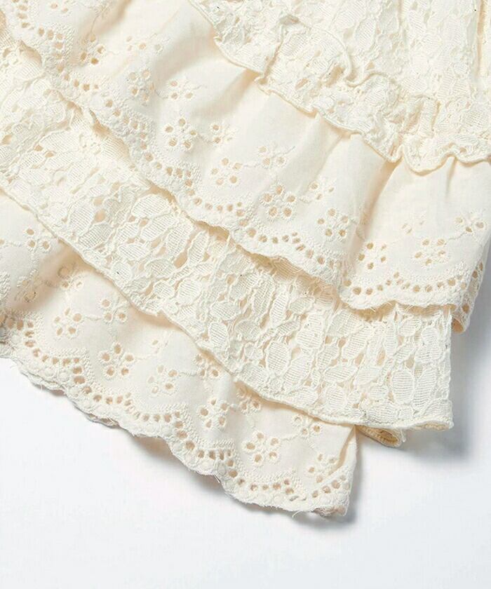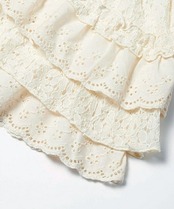 ・ふんだんにつかわれてるコットンレースが嬉しい♪フンワリ、コットンキャンディーの様、可愛い姿にママも微笑んでしまいそうな、スカートに見えて動きやすいパンツデザインが嬉しい★