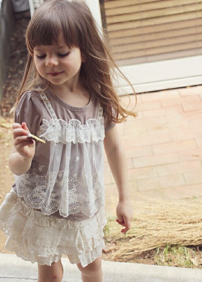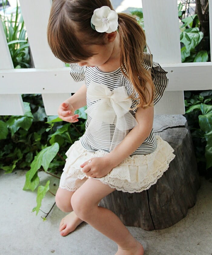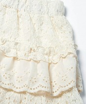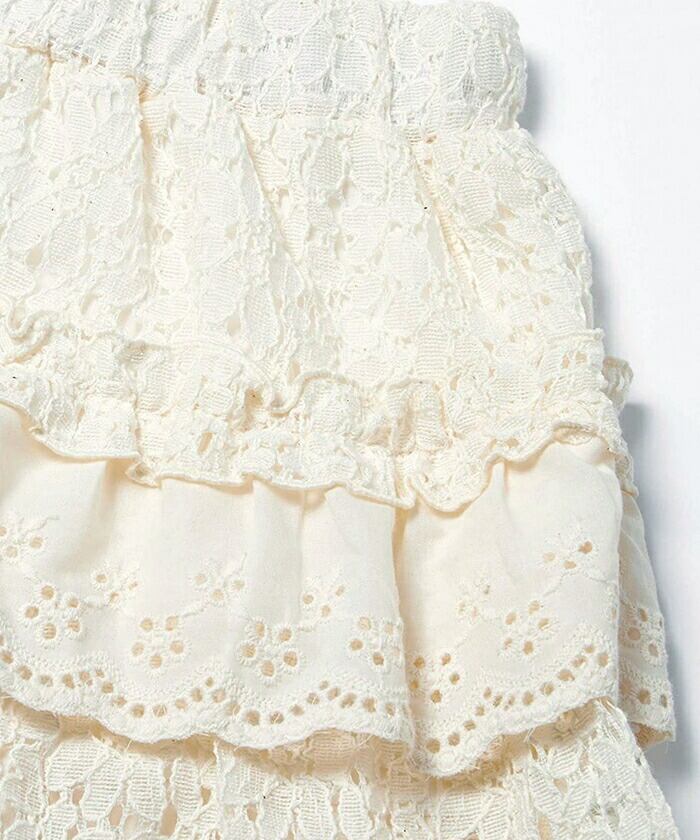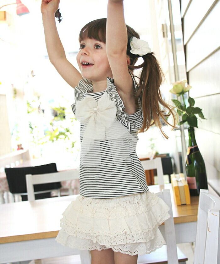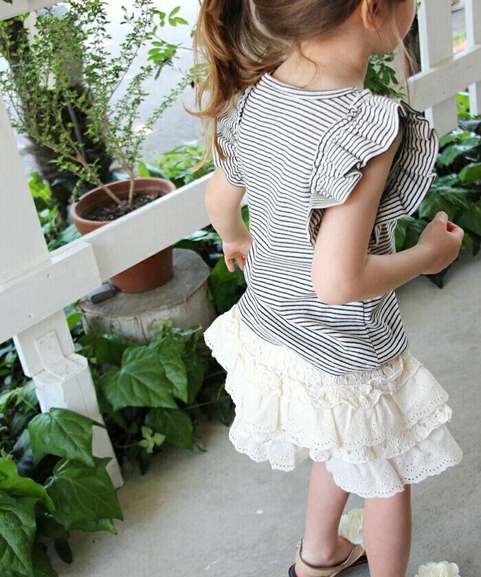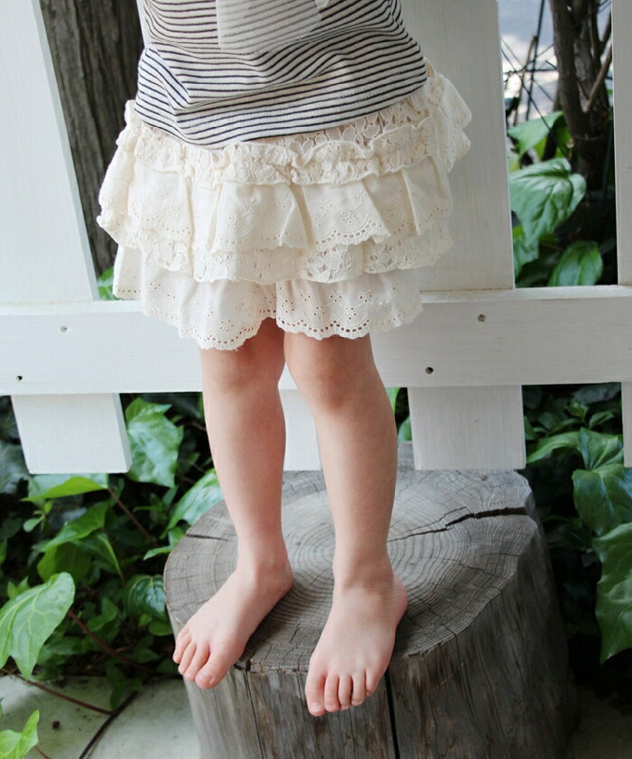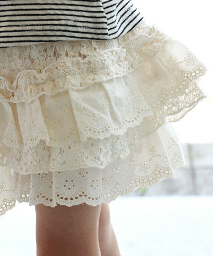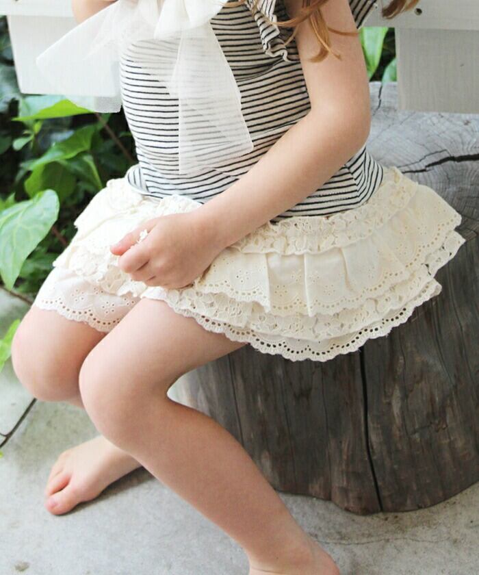 ・ 子供服ではありそうでないコットンレースがナチュラルな雰囲気いっぱい♪歩くと心もフワフワ甘ぁ〜い気分になれそう〜元気な女の子でもロマンチックになれるキュロットスカートです。