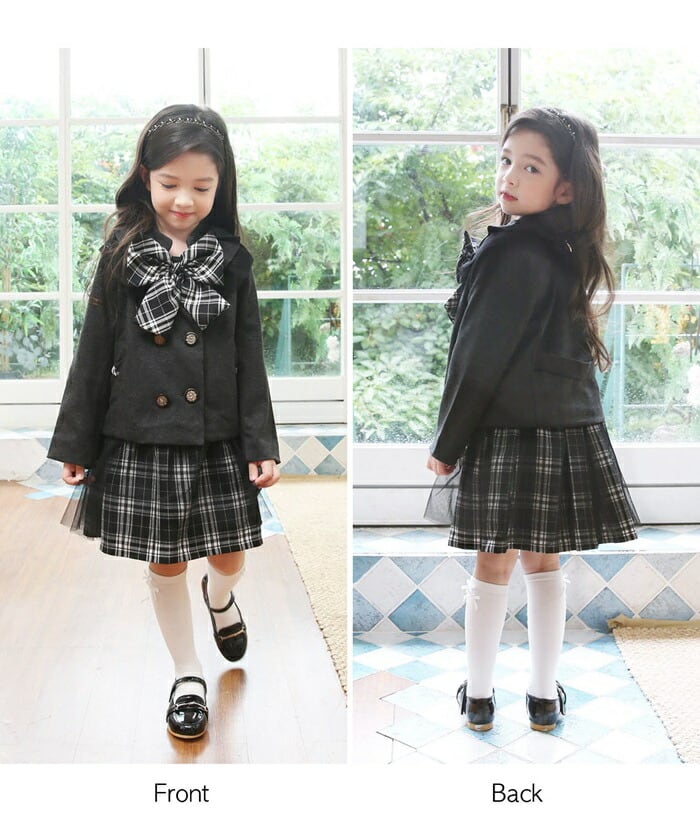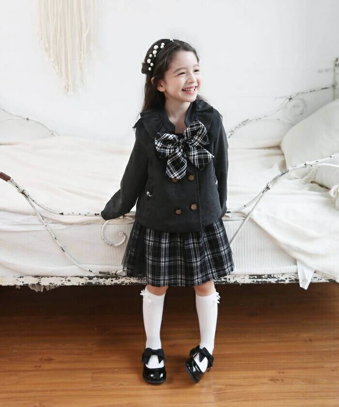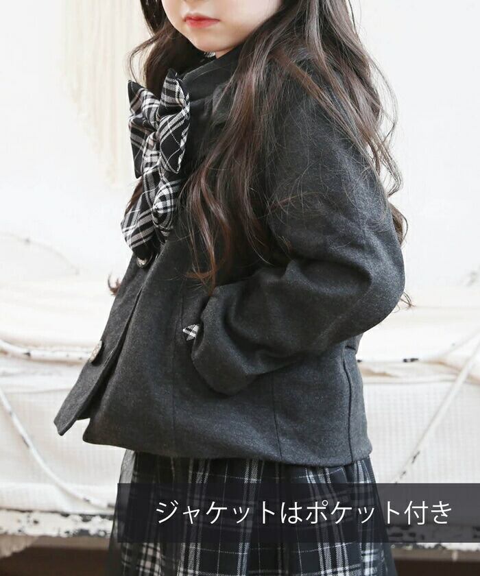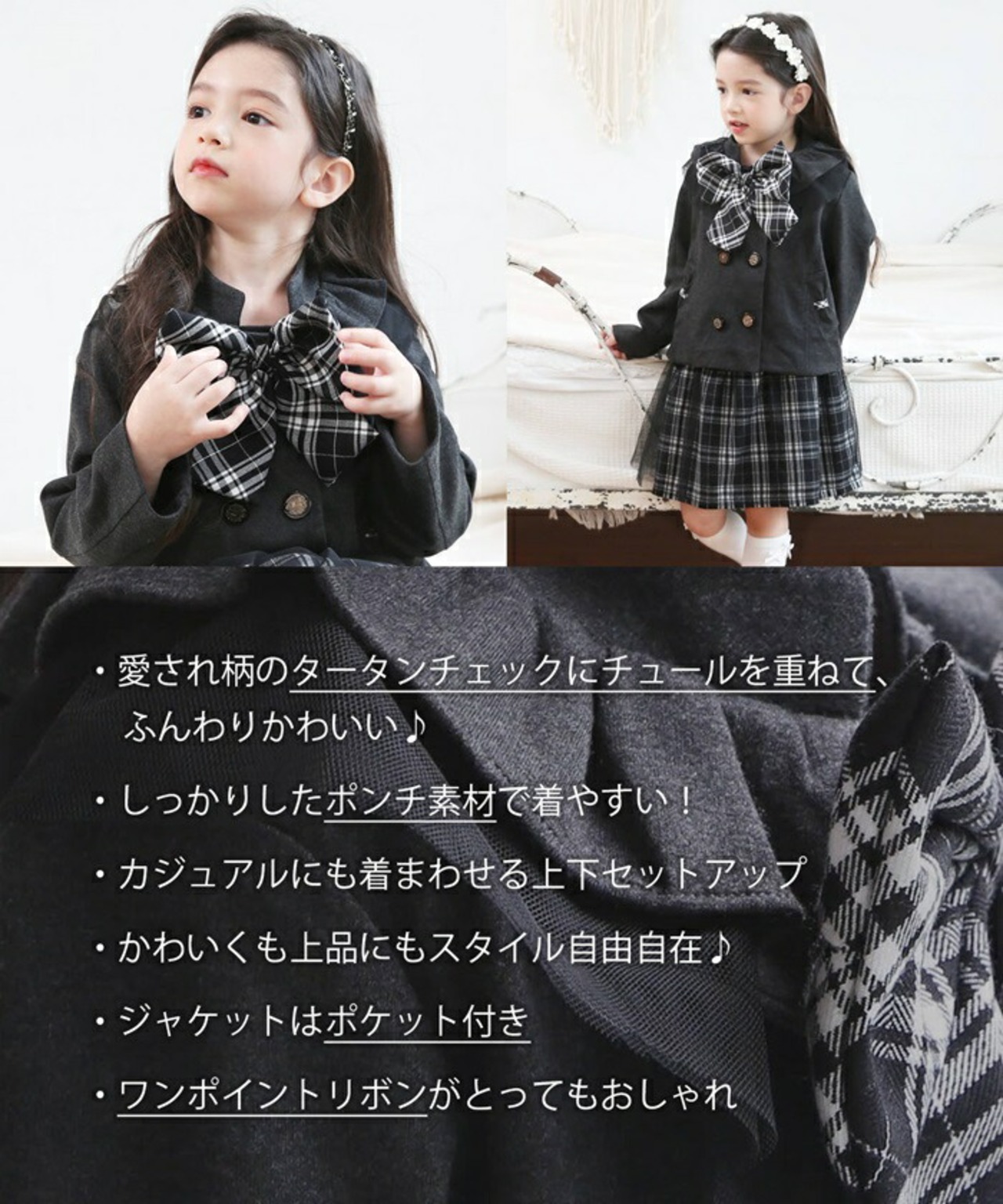 ・他とは被らない気取らないおしゃれが好き♪そして、この快適な着用感二度と見逃したくない!トラッドスタイルのピーコートをベースにプリーツ×チュールを合わせた、ジャケットとスカートの上下セットはセレブキッズフォーマルスタイルを即完成♪スカートは愛され柄のタータンチェックにチュールを重ねて、ふんわり優しいイメージに♪しっかりしたポンチ素材で 着やすさを重視したジャケットは、大きなタータンチェックのリボンブローチをセットにすることで、上品な雰囲気をプラスしました。