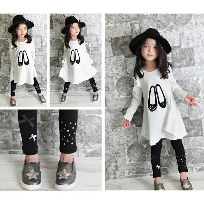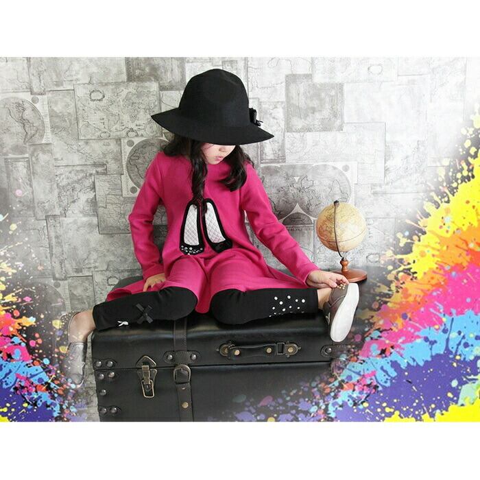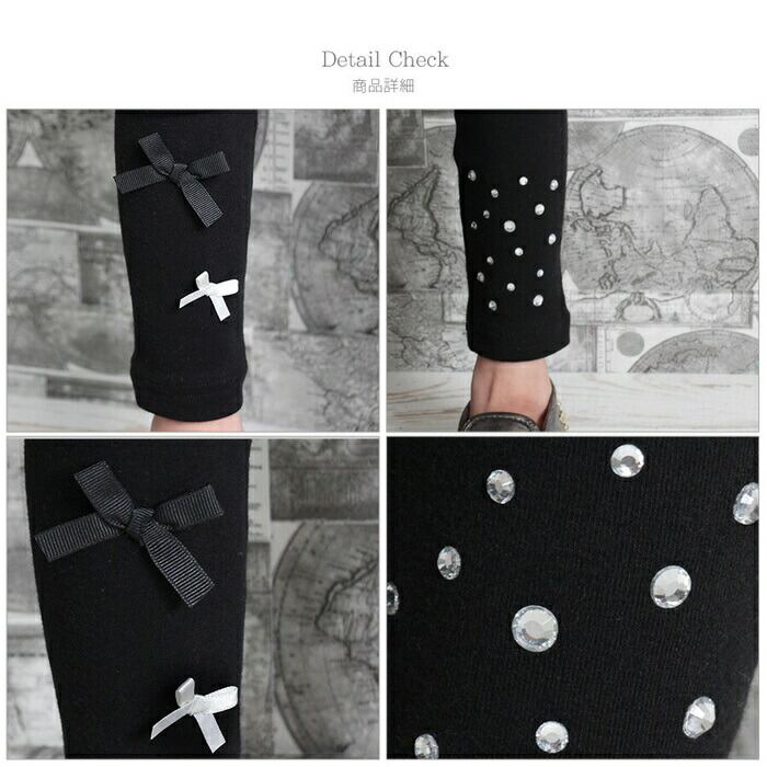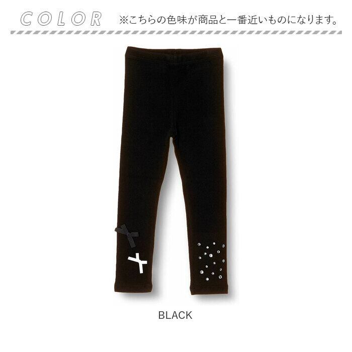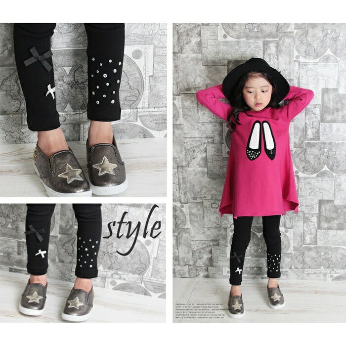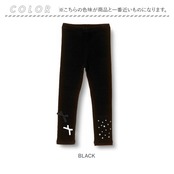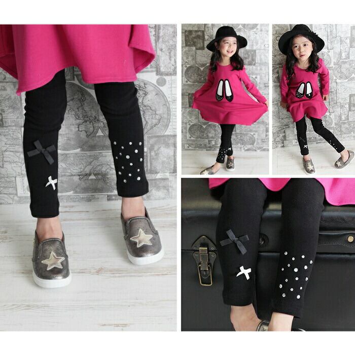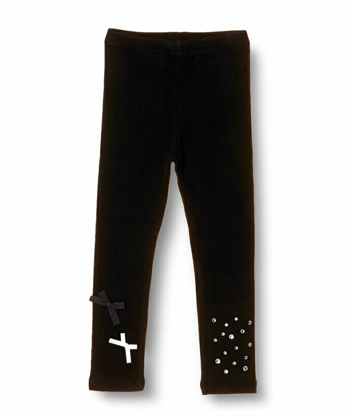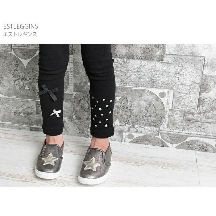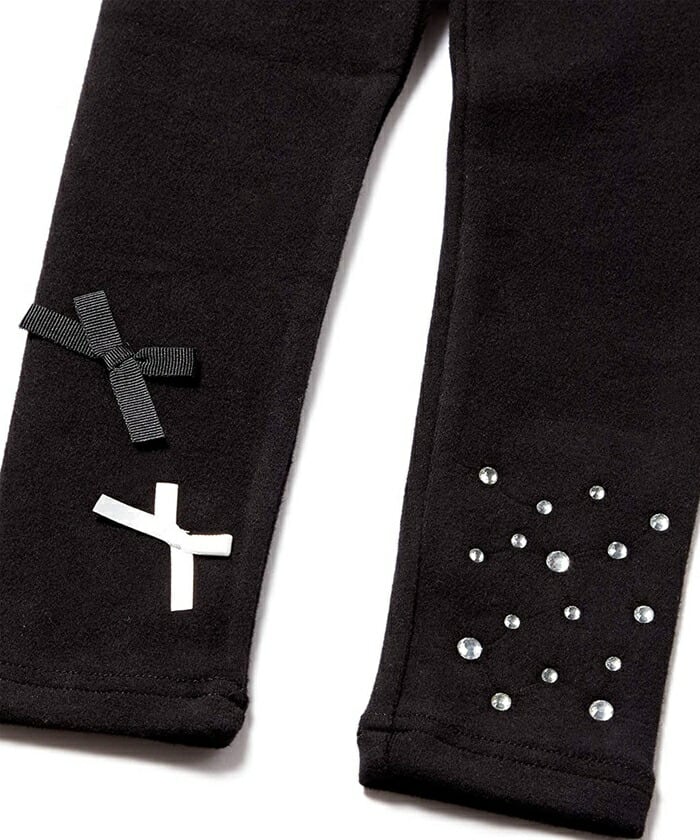 ・そんなレギンスですが、無地のレギンスだとつまらない〜ブラック地にキラキラしたストーンを左足に、小さなリボン2つを右足にあしらいアシメントリーなデザインに仕上げた子供服Roraエストブラックレギンスは、無地よりもさりげなくおしゃれ♪けれども、無地のレギンスのようにコーディネートしやすいのが特徴です。