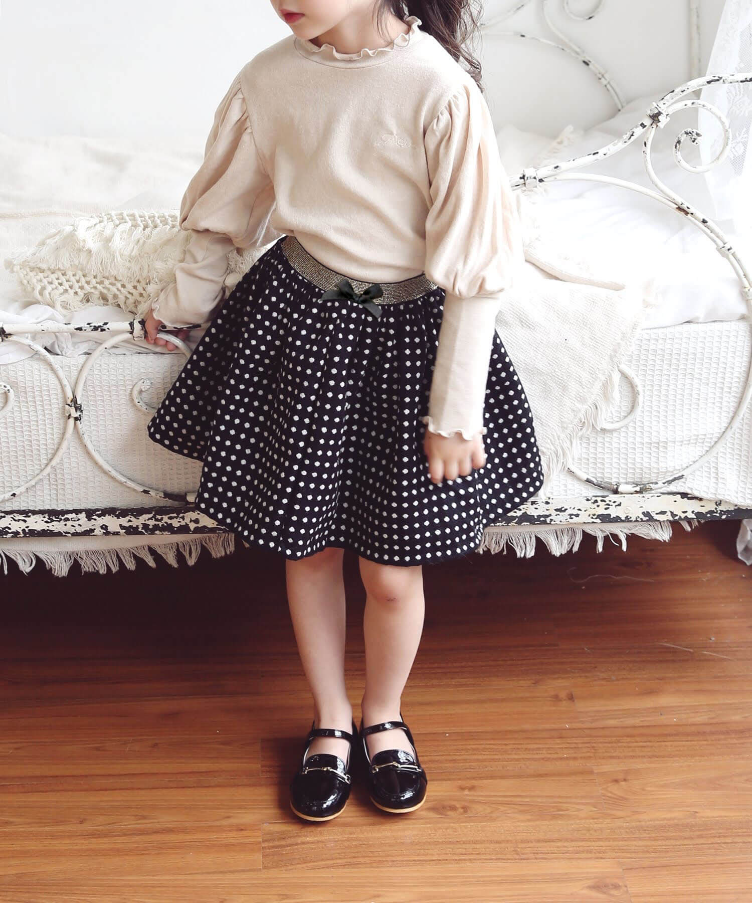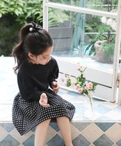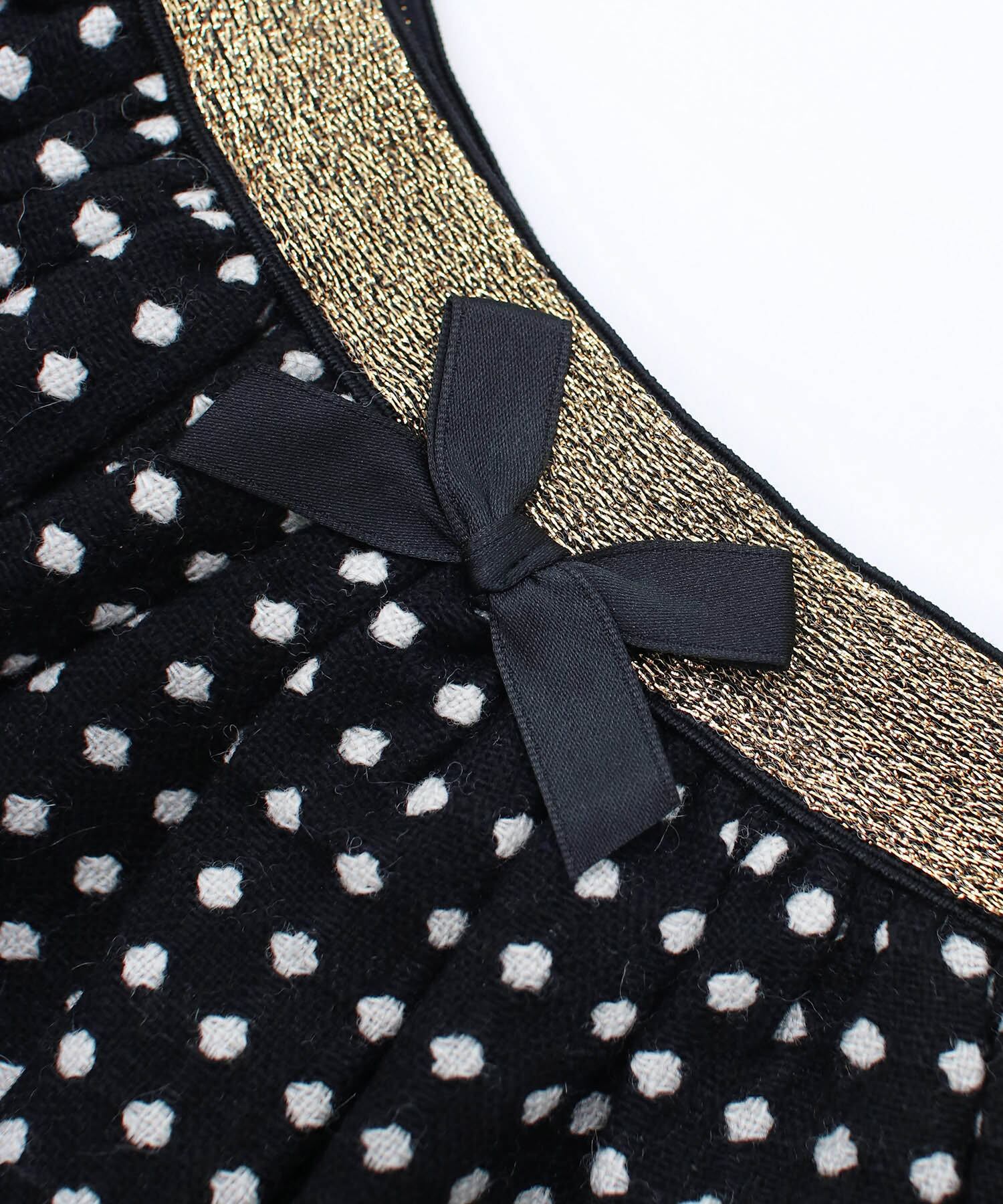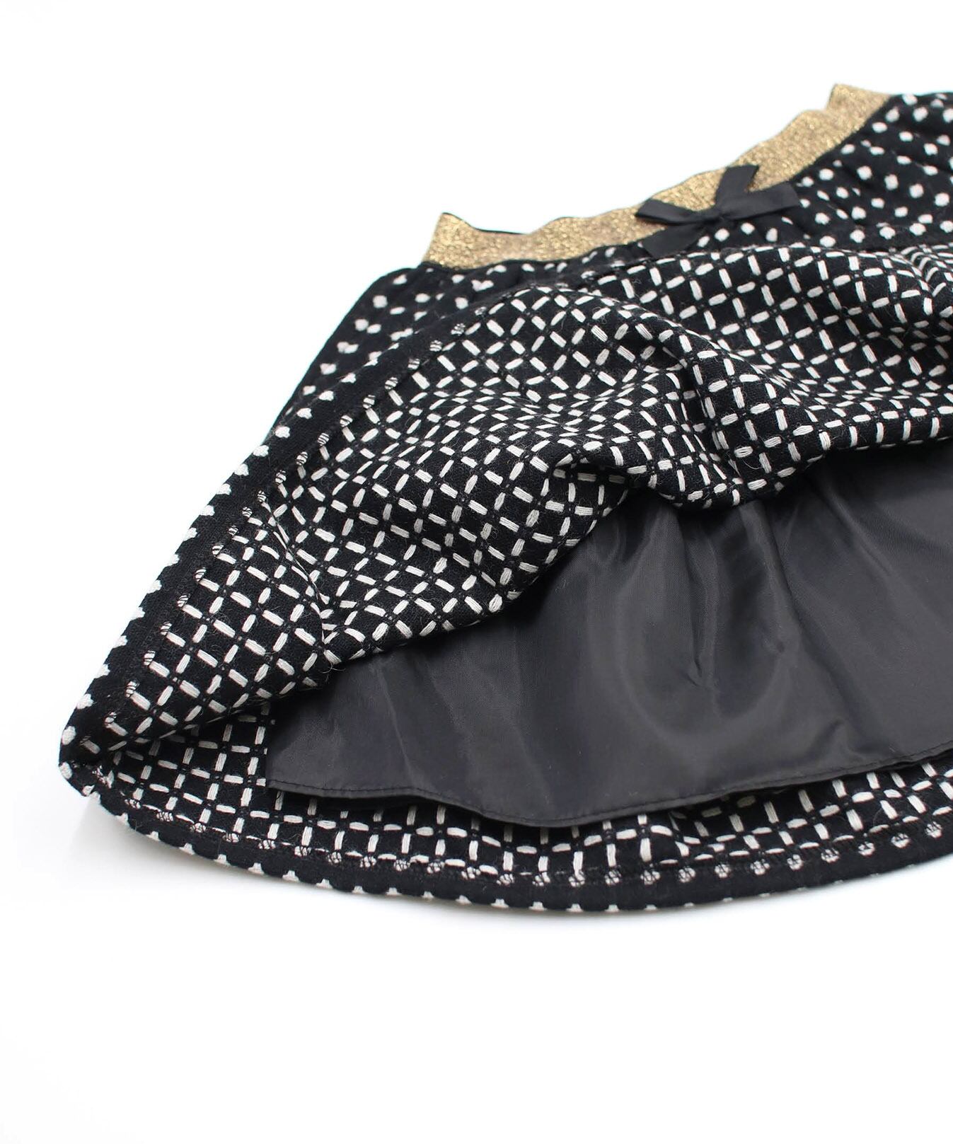 ・生地本来の厚手の素材やハリ感で表現したふんわりボリューム感がさりげなく可愛い〜 規則正しくそろえたドット柄は、チェック柄にも見え トップス次第でフォーマルにもデイリーユースに コーディネートしやすい嬉しいスカートに。ブラウスもカットソーも「イン」するだけで キラキラとしたゴールドが全身を引き締めて見せてくれるポイント センターのプチリボンも、女の子気分を高めてくれる秘訣!季節やシーンに問わず使いやすいブラックで、長くご利用いただけます。