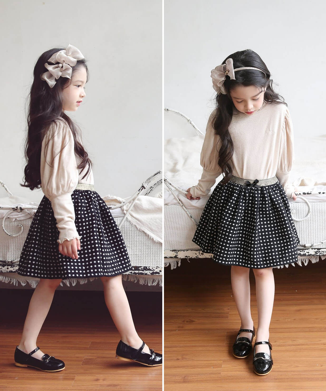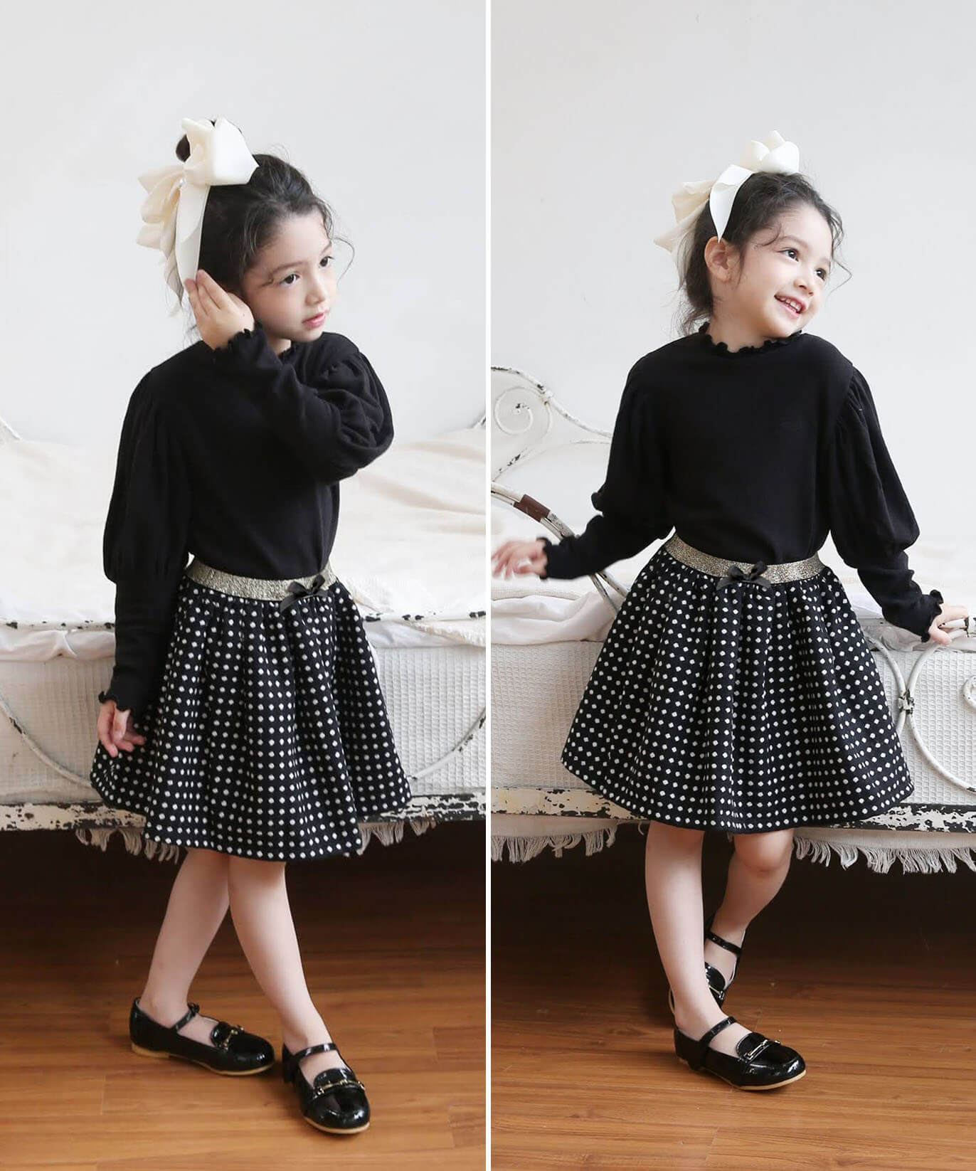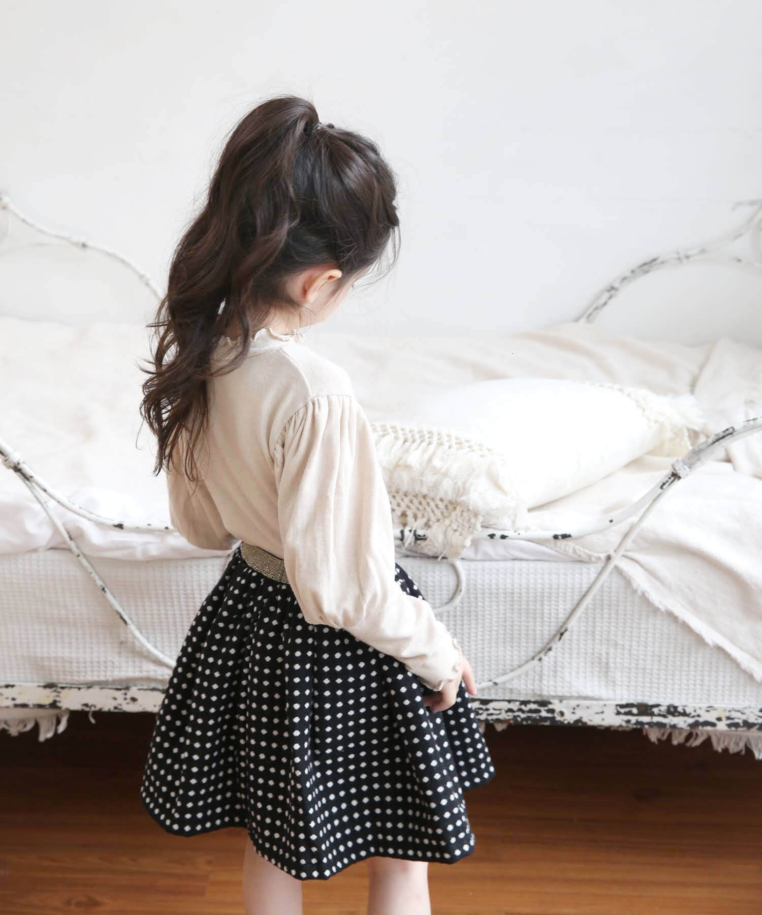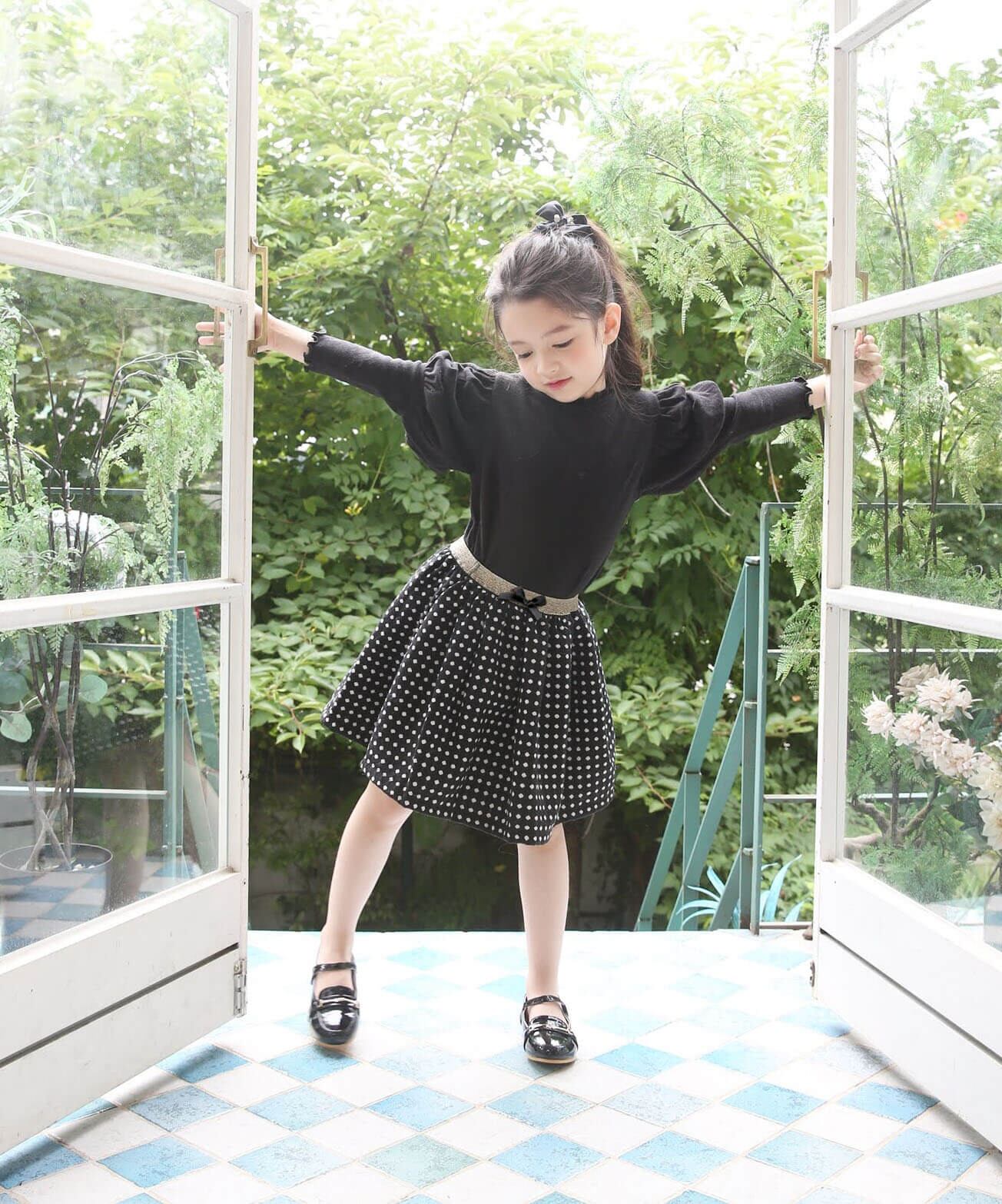 ・生地本来の厚手の素材やハリ感で表現したふんわりボリューム感がさりげなく可愛い〜 規則正しくそろえたドット柄は、チェック柄にも見え トップス次第でフォーマルにもデイリーユースに コーディネートしやすい嬉しいスカートに。ブラウスもカットソーも「イン」するだけで キラキラとしたゴールドが全身を引き締めて見せてくれるポイント センターのプチリボンも、女の子気分を高めてくれる秘訣!季節やシーンに問わず使いやすいブラックで、長くご利用いただけます。