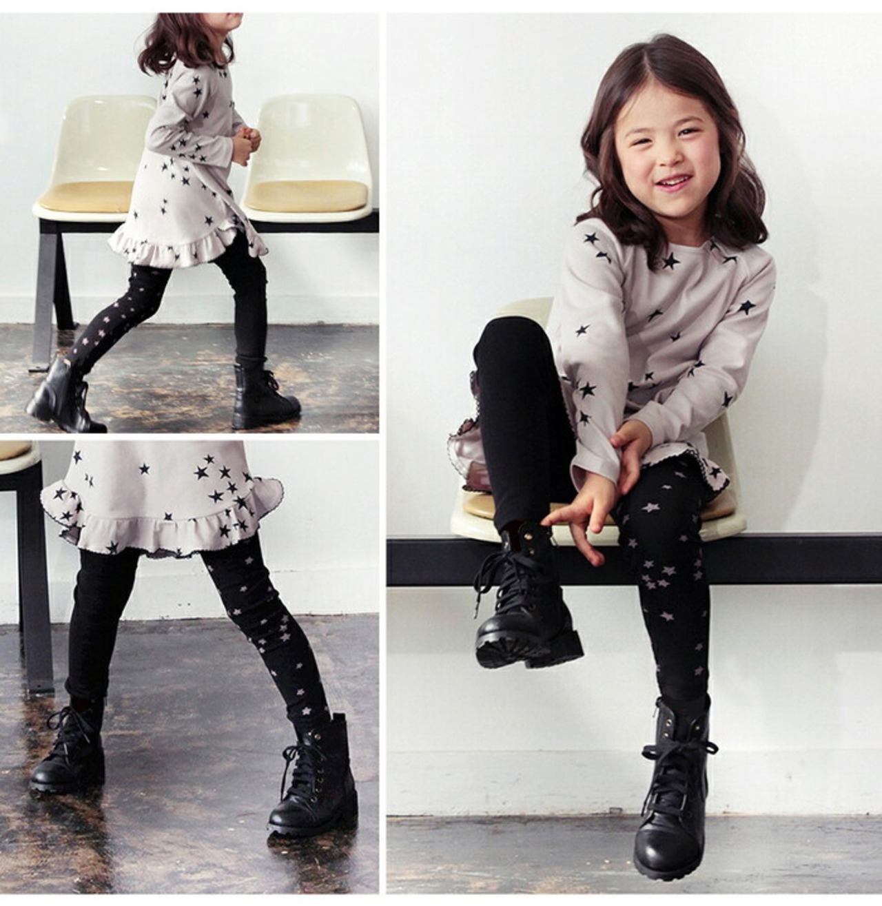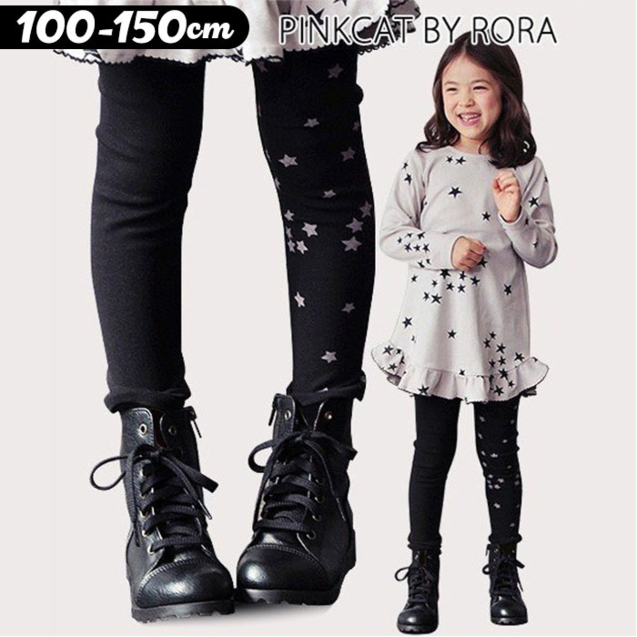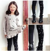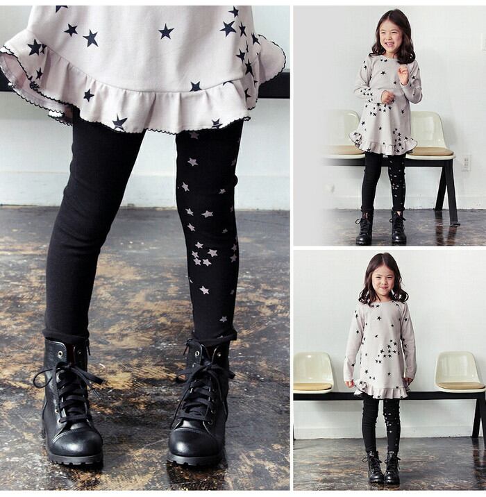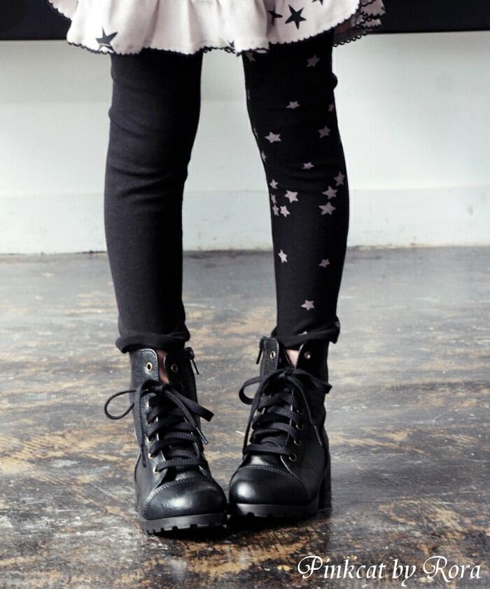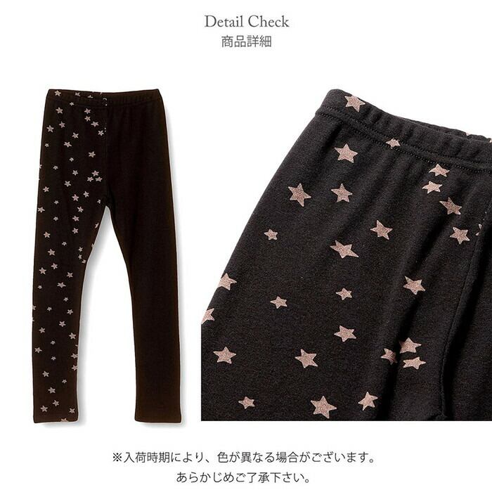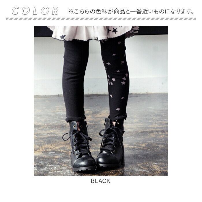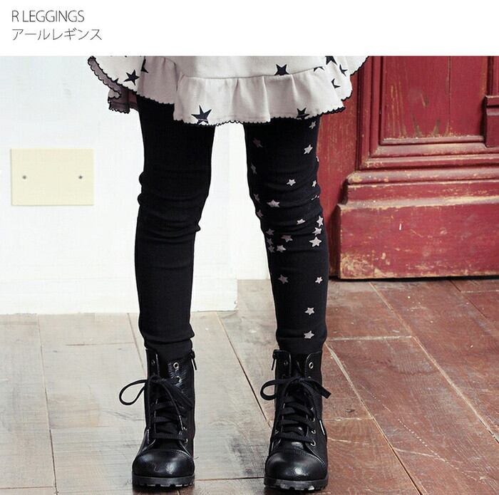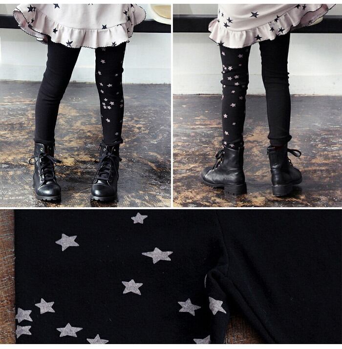 ・子供っぽくなりがちな星柄をトーンダウンさせたカラーコンビネーションやブラック無地と星柄パターンを左右にしたアシンメトリーデザインで カジュアルになりすぎず大人な雰囲気を加えたキッズレギンスです。