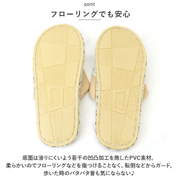 ・底面は滑りにくいよう若干の凹凸加工を施したPVC素材。柔らかいのでフローリングなどを傷つけることなく、転倒などからガード。歩いた時のパタパタ音も気にならない♪
