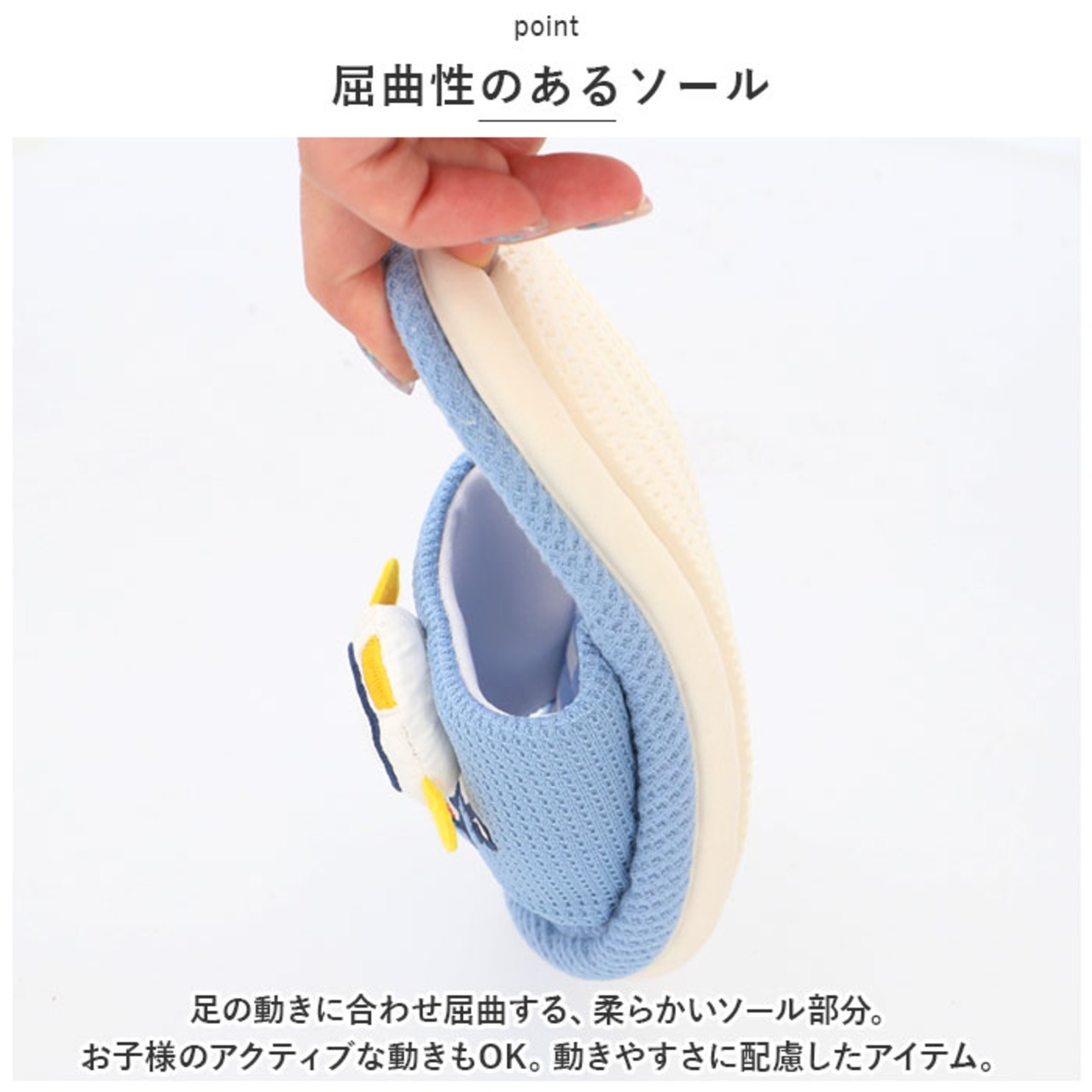 ・足の動きに合わせ屈曲する、柔らかいソール部分。お子様のアクティブな動きもOK。動きやすさに配慮したアイテム。