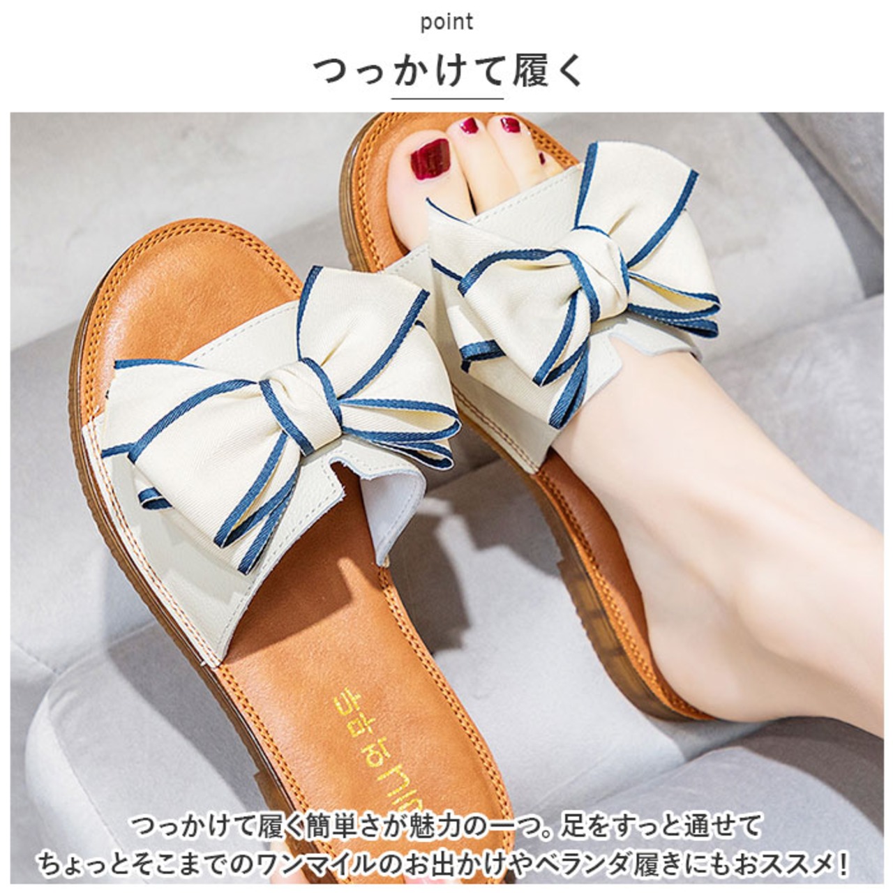 ・つっかけて履く簡単さが魅力の一つ。足をすっと通せてちょっとそこまでのワンマイルのお出かけやベランダ履きにもおススメ!