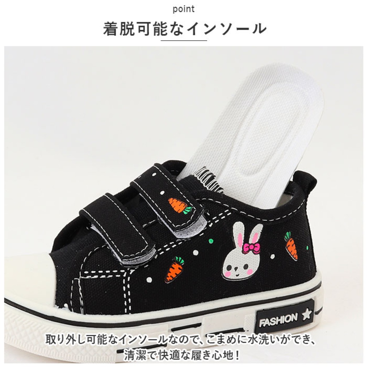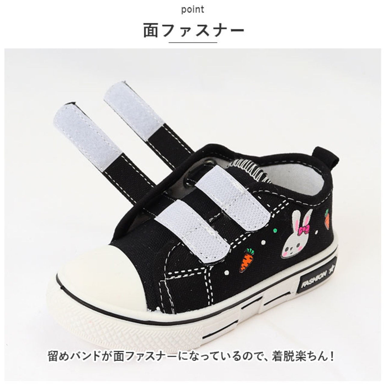 ・アッパー部分にはウサギの可愛いプリントがあり、履いてお出かけするのが楽しくなる!