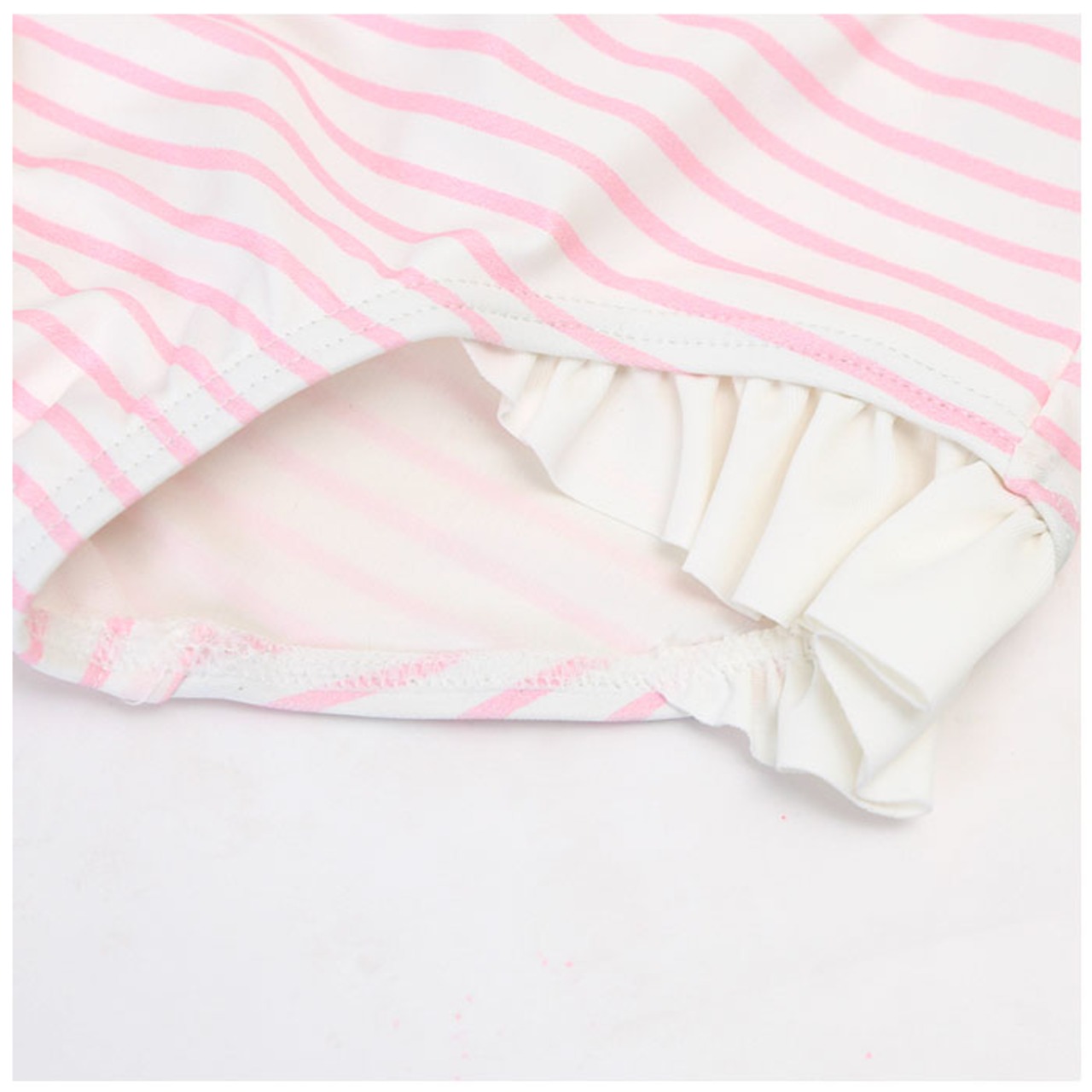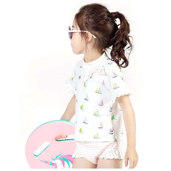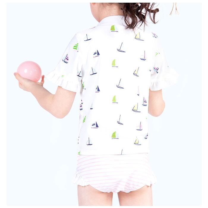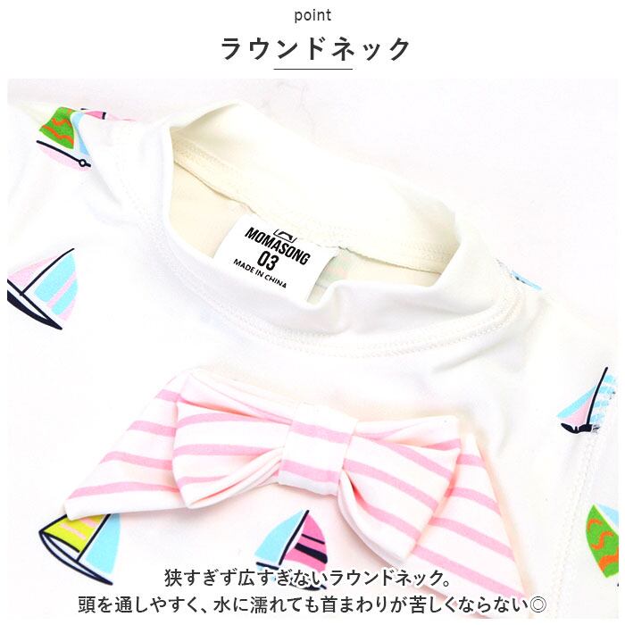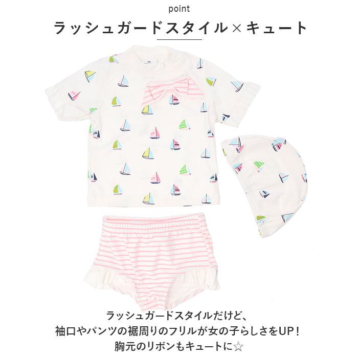 ・ラッシュガードスタイルだけど、袖口やパンツの裾周りのフリルが女の子らしさをUP!胸元のリボンもキュートに☆