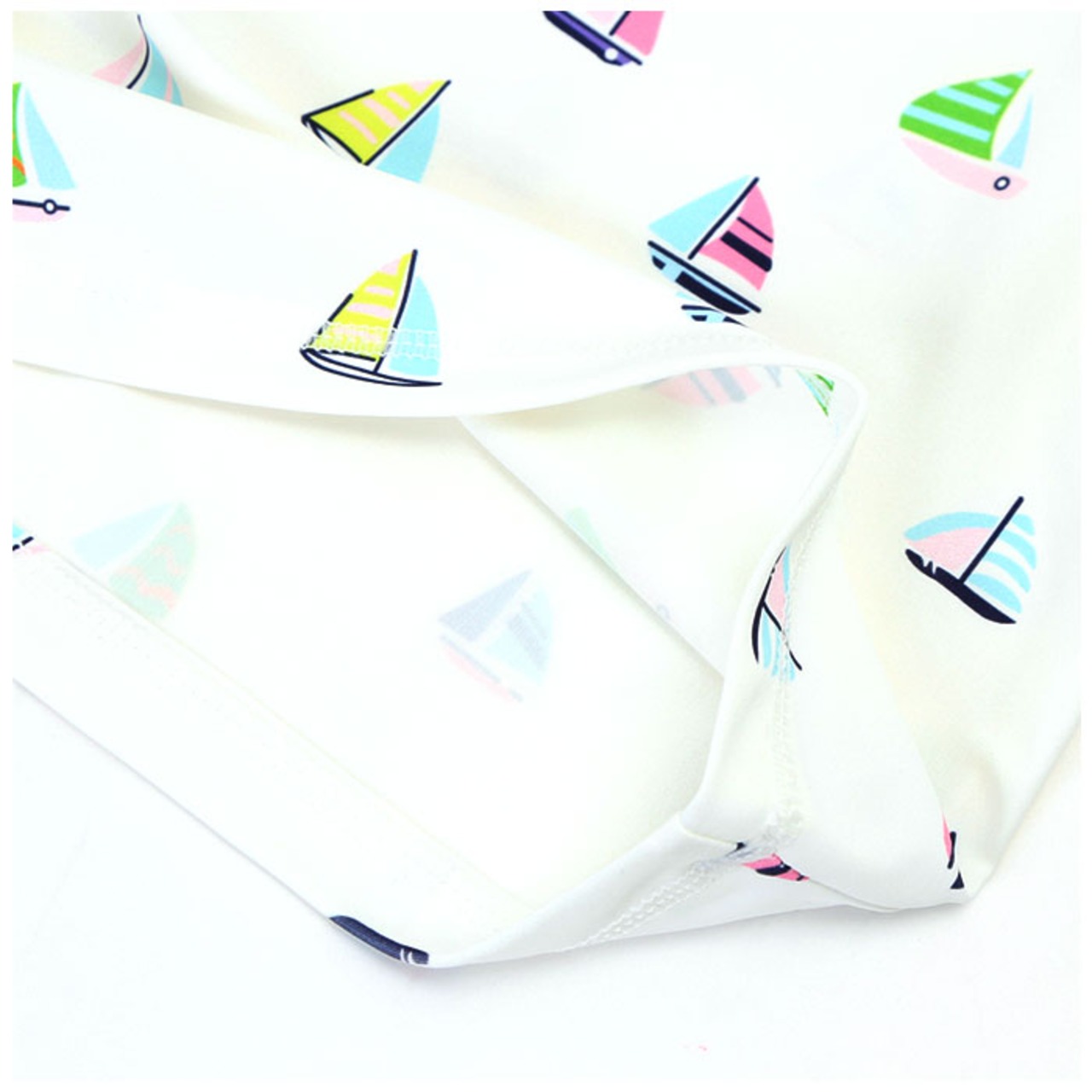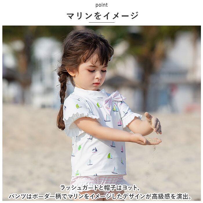 ・ラッシュガードと帽子はヨット、パンツはボーダー柄でマリンをイメージしたデザインが高級感を演出。
