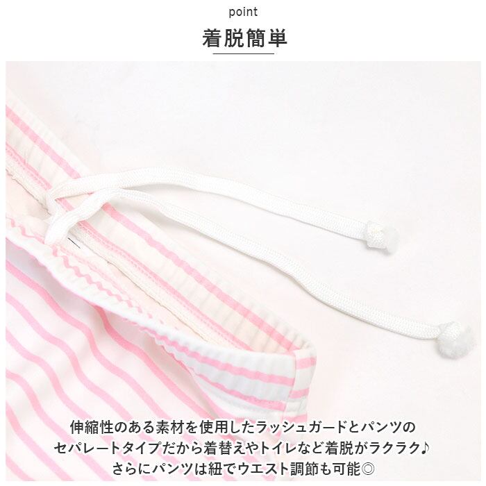 ・伸縮性のある素材を使用したラッシュガードとパンツのセパレートタイプだから着替えやトイレなど着脱がラクラク♪さらにパンツは紐でウエスト調節も可能◎
