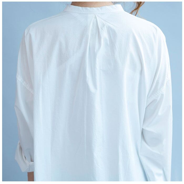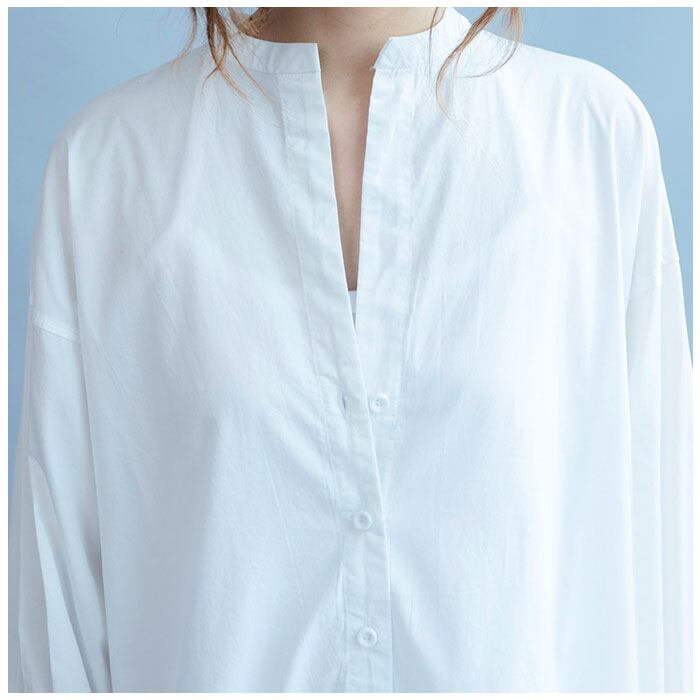 ・首元がすっきりと見えるスタンドカラータイプ。胸下あたりまでのフロントボタン付き。