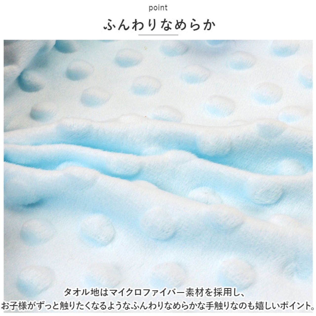 ・タオル地はマイクロファイバー素材を採用し、お子様がずっと触りたくなるようなふんわりなめらかな手触りなのも嬉しいポイント。