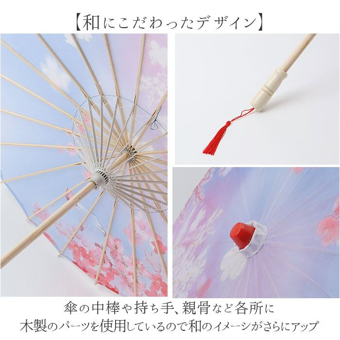 ・傘の中棒や持ち手、親骨など各所に木製のパーツを使用しているので和のイメーシがさらにアップ