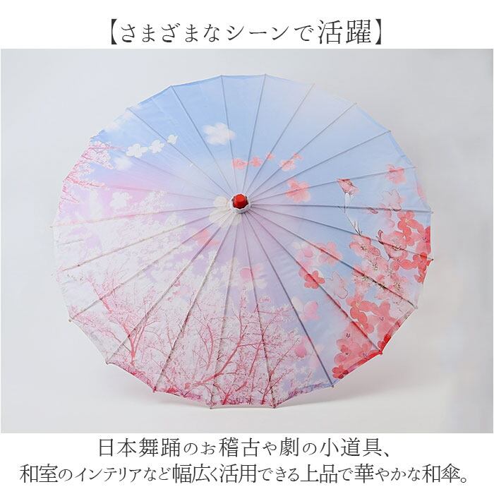 ・日本舞踊のお稽古や劇の小道具、和室のインテリアなど幅広く活用できる上品で華やかな和傘。