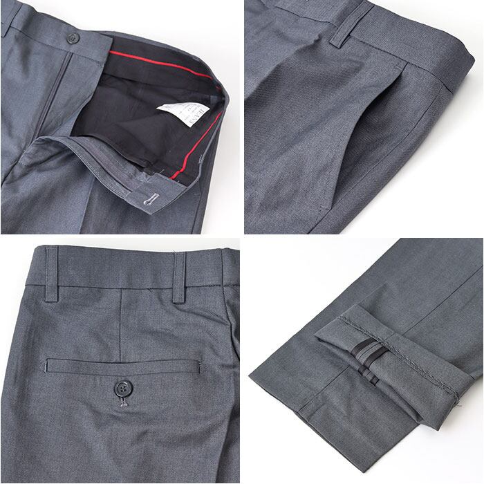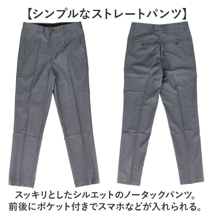 ・スッキリとしたシルエットのノータックパンツ。前後にポケット付きでスマホなどが入れられる。