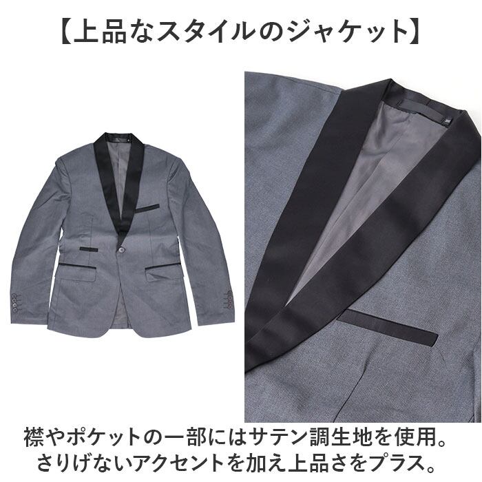 ・襟やポケットの一部にはサテン調生地を使用。さりげないアクセントを加え上品さをプラス。
