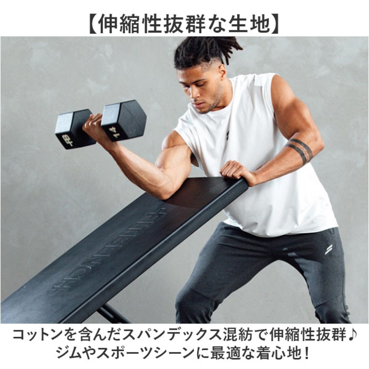 ・コットンを含んだスパンデックス混紡で伸縮性抜群♪ジムやスポーツシーンに最適な着心地!