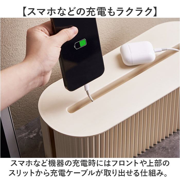 ・スマホなど機器の充電時にはフロントや上部のスリットから充電ケーブルが取り出せる仕組み。