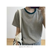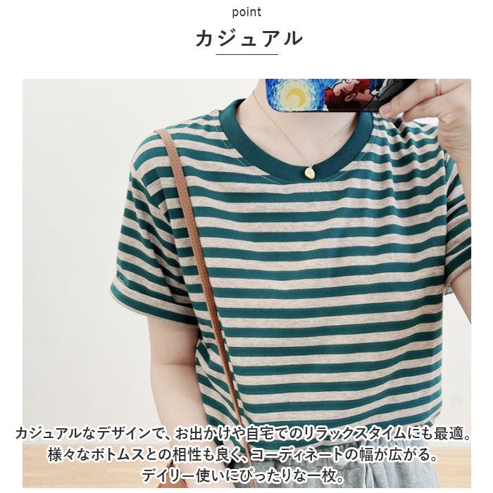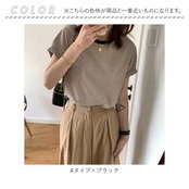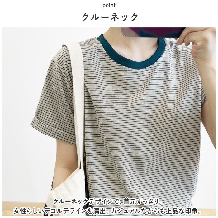 ・クルーネックデザインで、首元すっきり。女性らしいデコルテラインを演出。カジュアルながらも上品な印象。