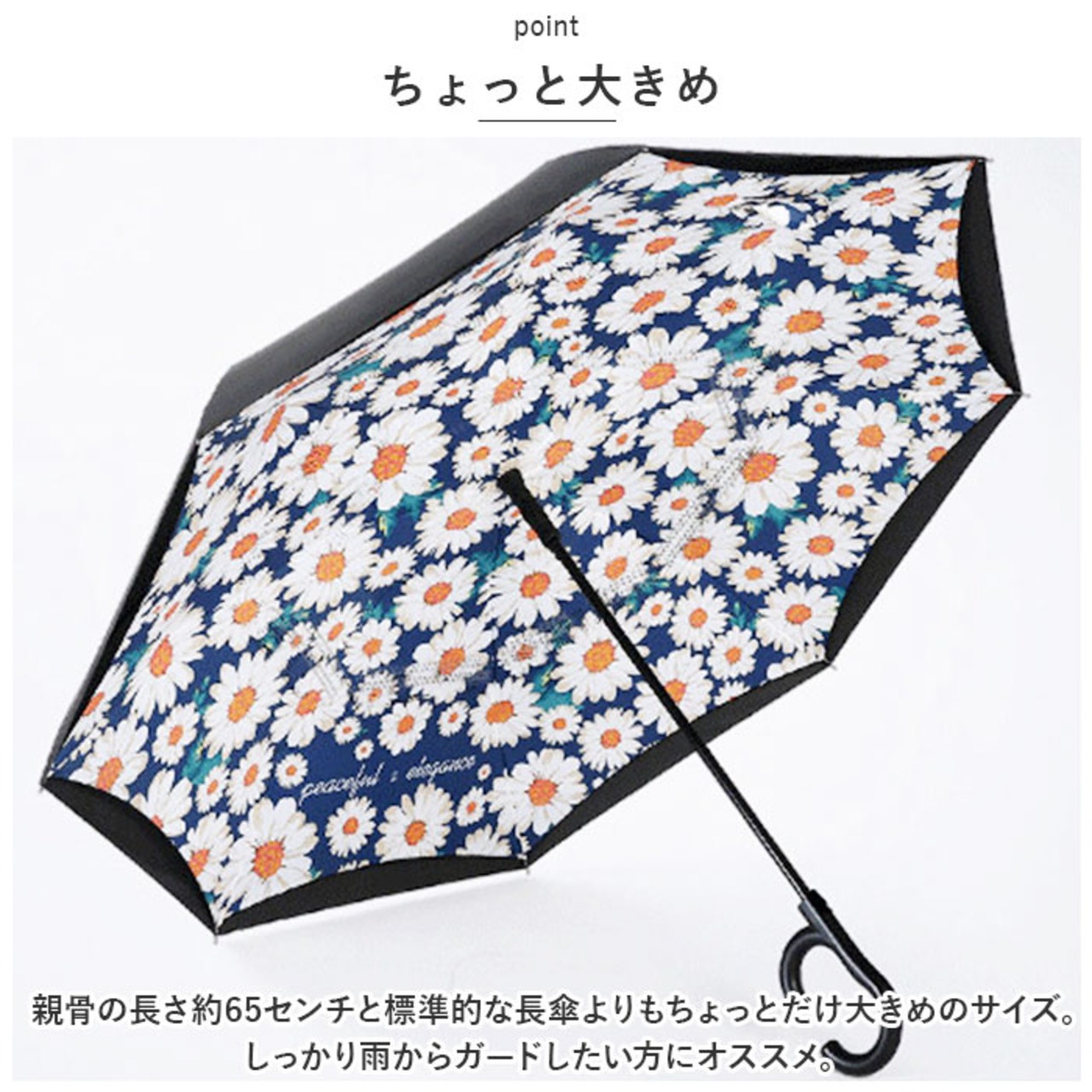 ・親骨の長さ約65センチと標準的な長傘よりもちょっとだけ大きめのサイズ。しっかり雨からガードしたい方にオススメ。