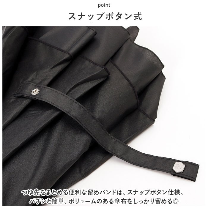 ・つゆ先をまとめる便利な留めバンドは、スナップボタン仕様。パチンと簡単、ボリュームのある傘布をしっかり留める◎