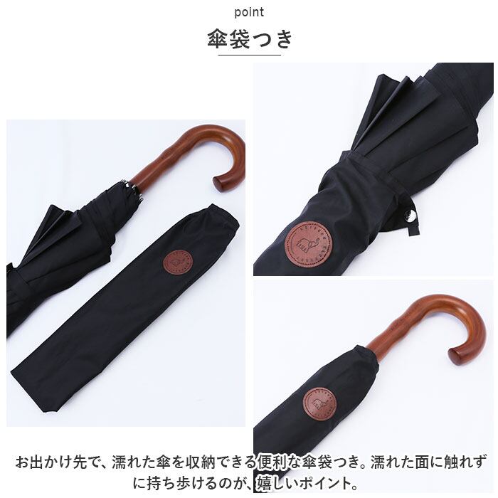 ・お出かけ先で、濡れた傘を収納できる便利な傘袋つき。濡れた面に触れずに持ち歩けるのが、嬉しいポイント。