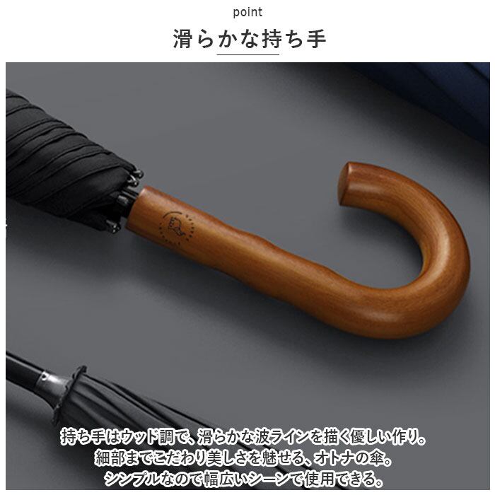 ・持ち手はウッド調で、滑らかな波ラインを描く優しい作り。細部までこだわり美しさを魅せる、オトナの傘。シンプルなので幅広いシーンで使用できる。