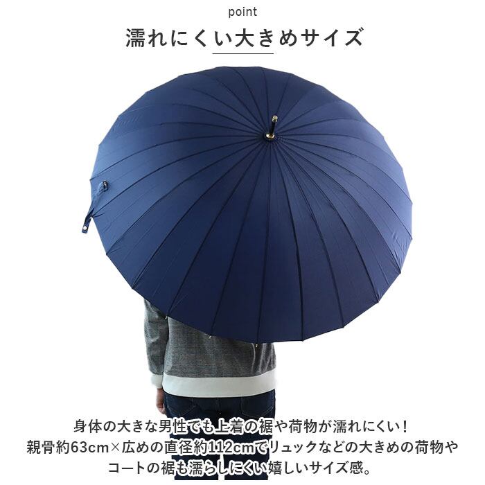 ・身体の大きな男性でも上着の裾や荷物が濡れにくい!親骨約63cm×広めの直径約112cmでリュックなどの大きめの荷物やコートの裾も濡らしにくい嬉しいサイズ感。