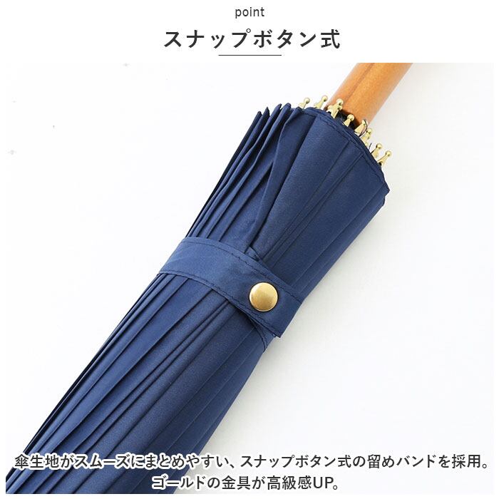 ・傘生地がスムーズにまとめやすい、スナップボタン式の留めバンドを採用。ゴールドの金具が高級感UP。