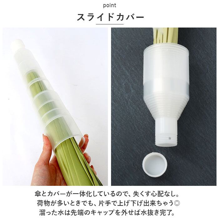 ・傘とカバーが一体化しているので、失くす心配なし。荷物が多いときでも、片手で上げ下げ出来ちゃう◎溜った水は先端のキャップを外せば水抜き完了。