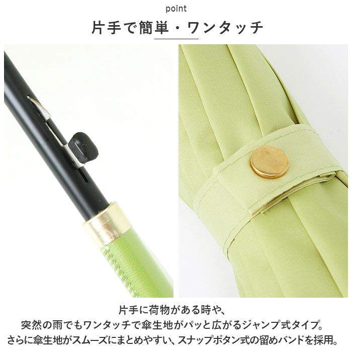 ・片手に荷物がある時や、突然の雨でもワンタッチで傘生地がパッと広がるジャンプ式タイプ。さらに傘生地がスムーズにまとめやすい、スナップボタン式の留めバンドを採用。