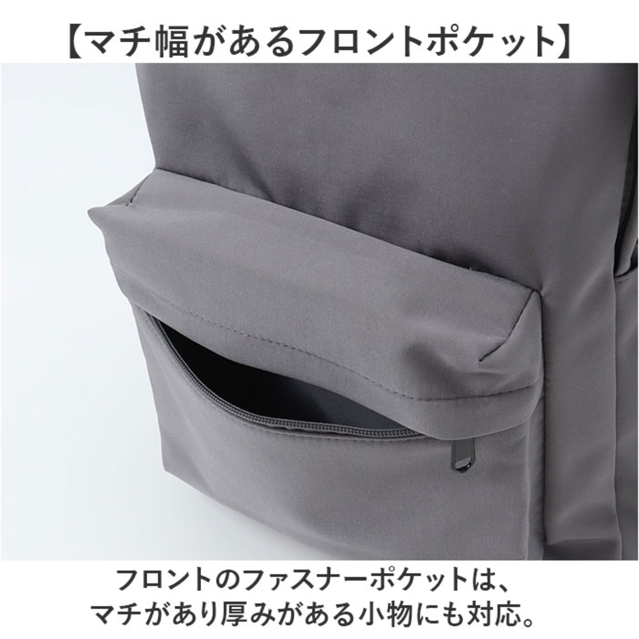 ・フロントのファスナーポケットは、マチがあり厚みがある小物にも対応。