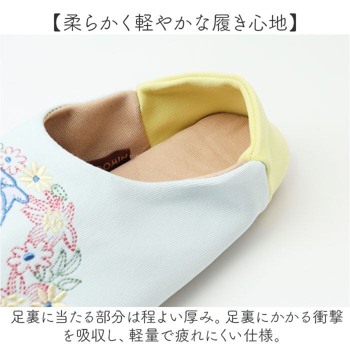 ・ソフトな底面はフローリングを傷つけにくく、歩いた時のパタパタ音も軽減。踵に滑り止め付き。
