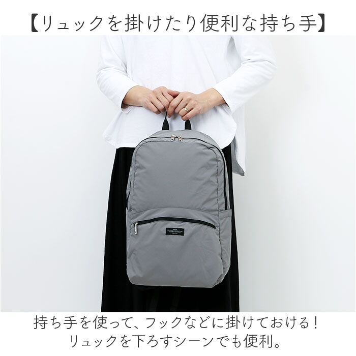 ・持ち手を使って、フックなどに掛けておける!リュックを下ろすシーンでも便利。