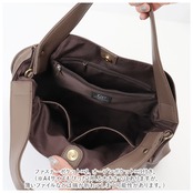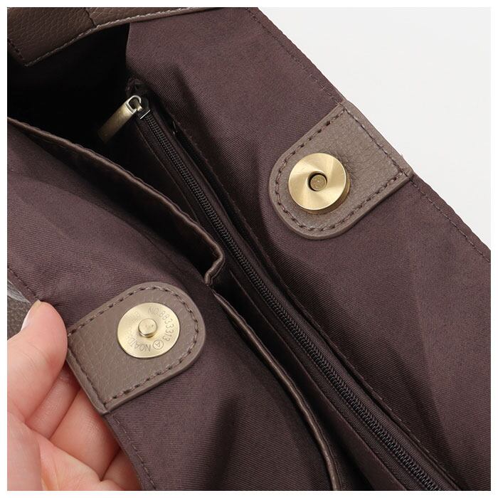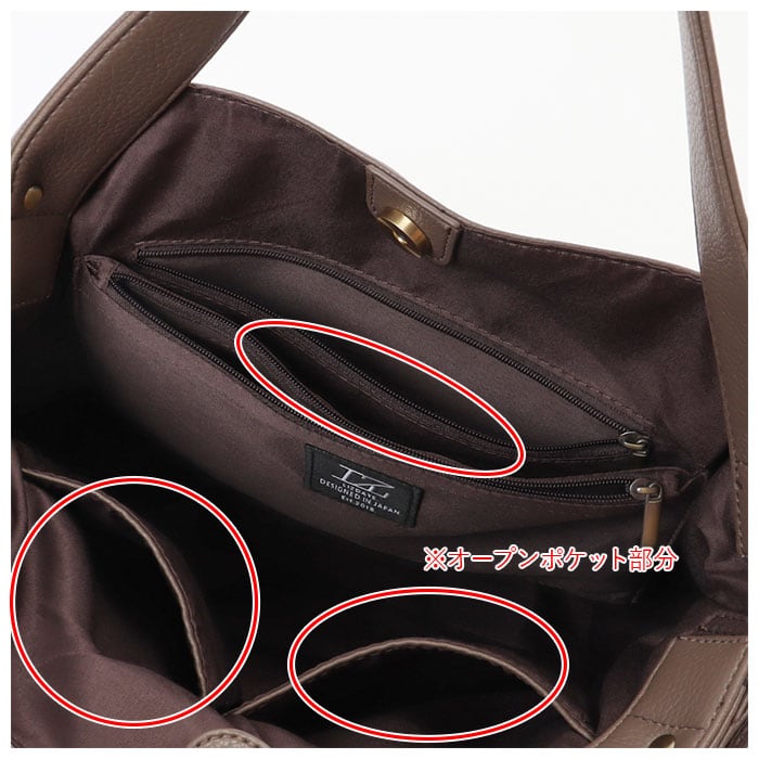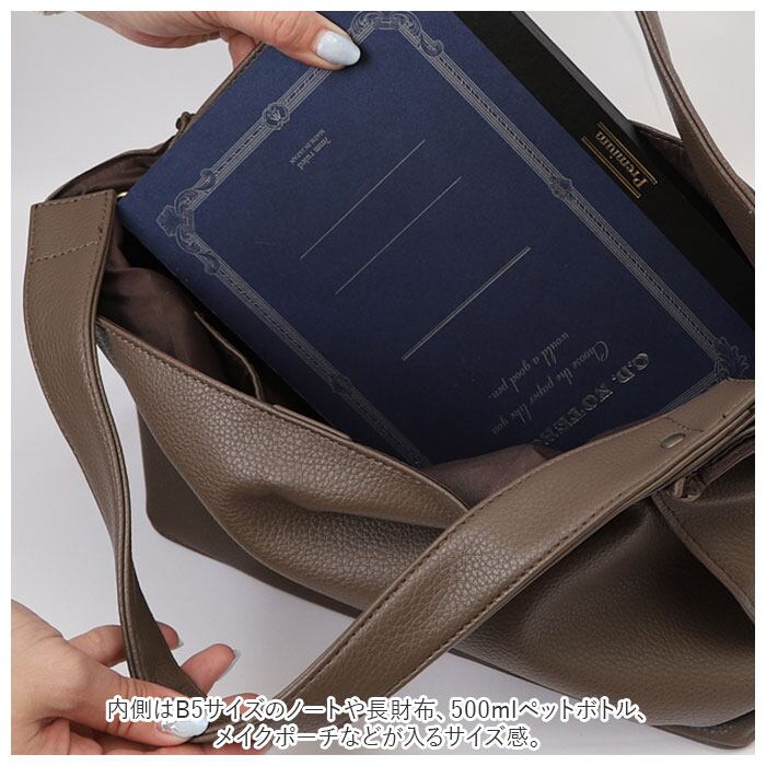 ・内側はB5サイズのノートや長財布、500mlペットボトル、メイクポーチなどが入るサイズ感。ファスナーポケット×2、オープンポケット×3付き。(※A4サイズもぴったり入る大きさではありますが、薄いファイルなどは端が折れてしまう可能性があります。)