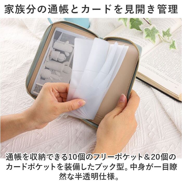 ・通帳を収納できる10個のフリーポケット&20個のカードポケットを装備したブック型。中身が一目瞭然な半透明仕様。
