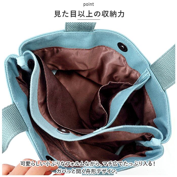 ・可愛らしい小ぶりなフォルムながら、マチ広でたっぷり入る!ガバっと開く舟形デザイン。
