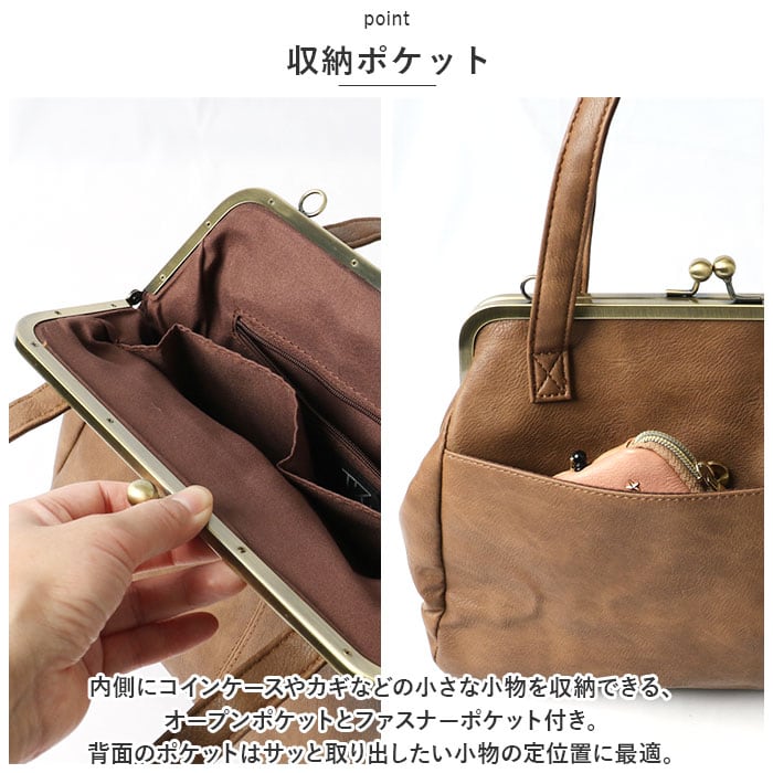 ・アンティークゴールドパーツを使用したがま口仕様でレトロ感ある雰囲気に♪パチッと片手で開け閉めができ中の荷物も見やすいのがポイント。