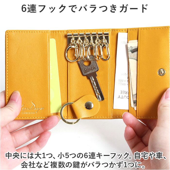 LIZDAYS 本革三つ折り6連キーケース 取り外せるキーリング付き