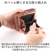 ・独立型の小銭入れはがま口タイプ。ひねりの位置を高くすることで開けやすく、ササマチ付きの2スペース仕様で出し入れラクラク。