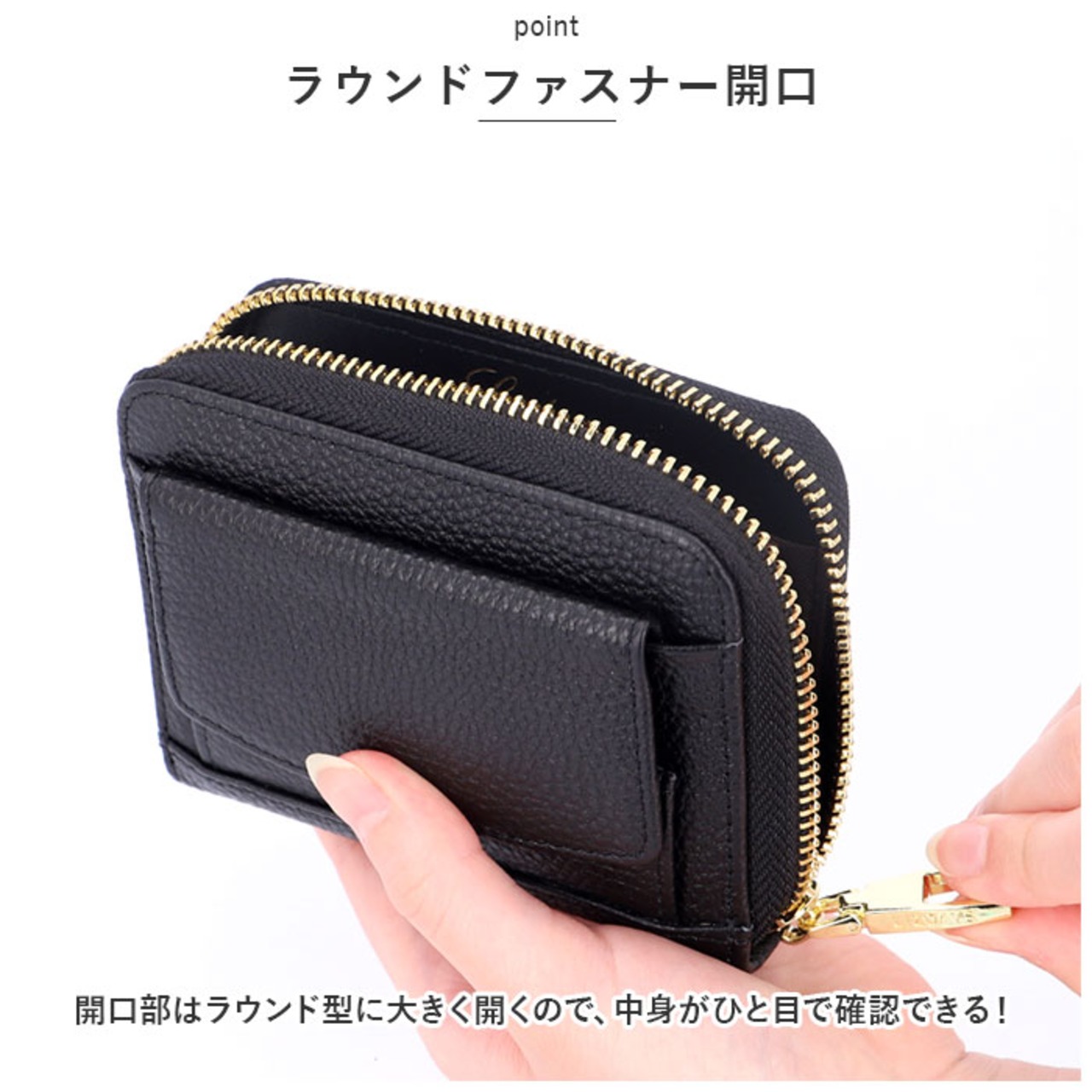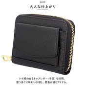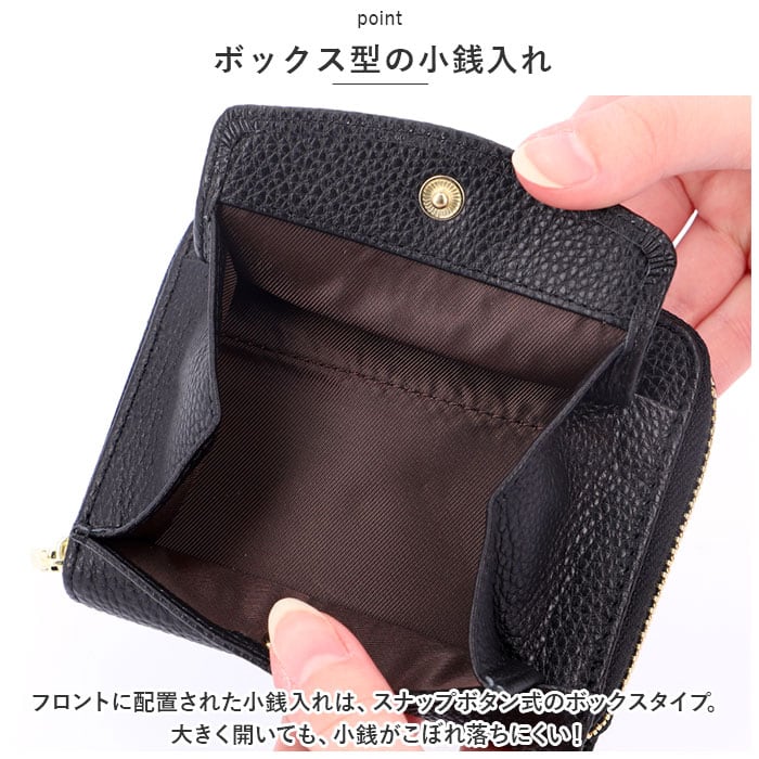 ・フロントに配置された小銭入れは、スナップボタン式のボックスタイプ。大きく開いても、小銭がこぼれ落ちにくい!