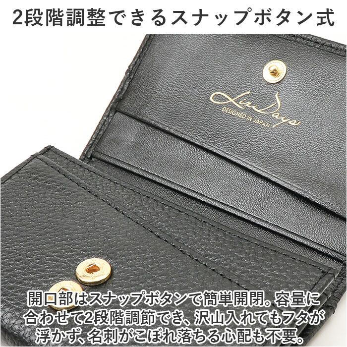 ・開口部はスナップボタンで簡単開閉。容量に合わせて2段階調節でき、沢山入れてもフタが浮かず、名刺がこぼれ落ちる心配も不要。